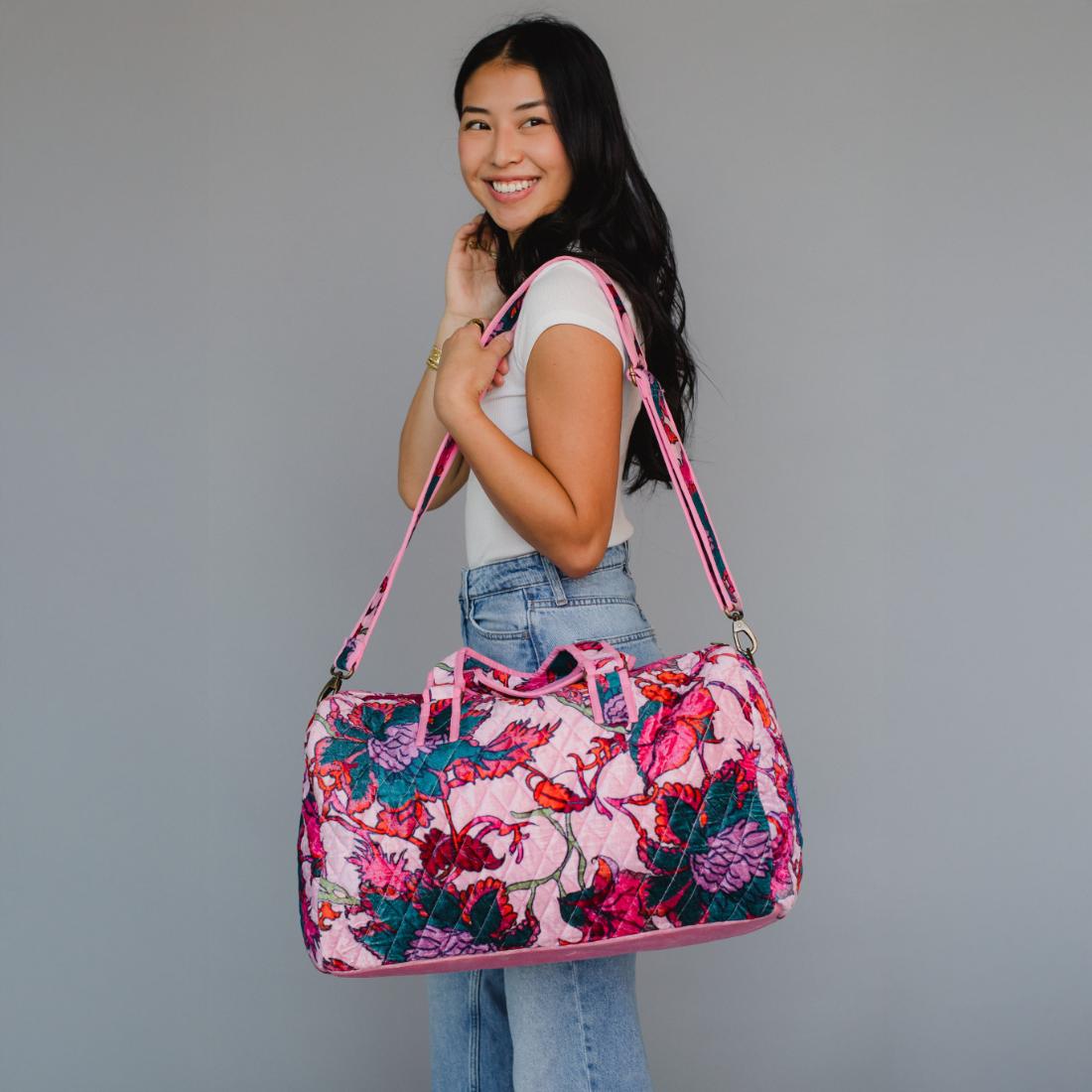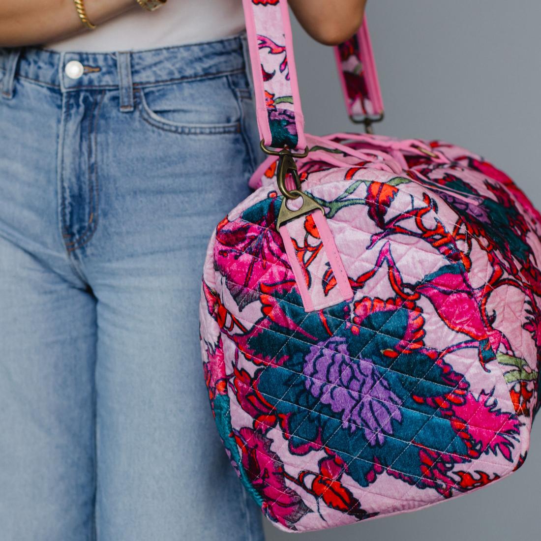 Make a bold statement with our velvet floral duffel bag that brings luxurious texture and vibrant style to every journey. This eye-catching weekender is perfect for weekend getaways, overnight trips, or any adventure where you want to travel in style. The secure zipper closure at the top protects your belongings, while thoughtful interior organization includes a zippered pocket for valuables and two small open pockets to keep essentials easily accessible. Spacious enough to hold your travel necessities, this velvet duffel adds a touch of elegance and personality to every trip.
