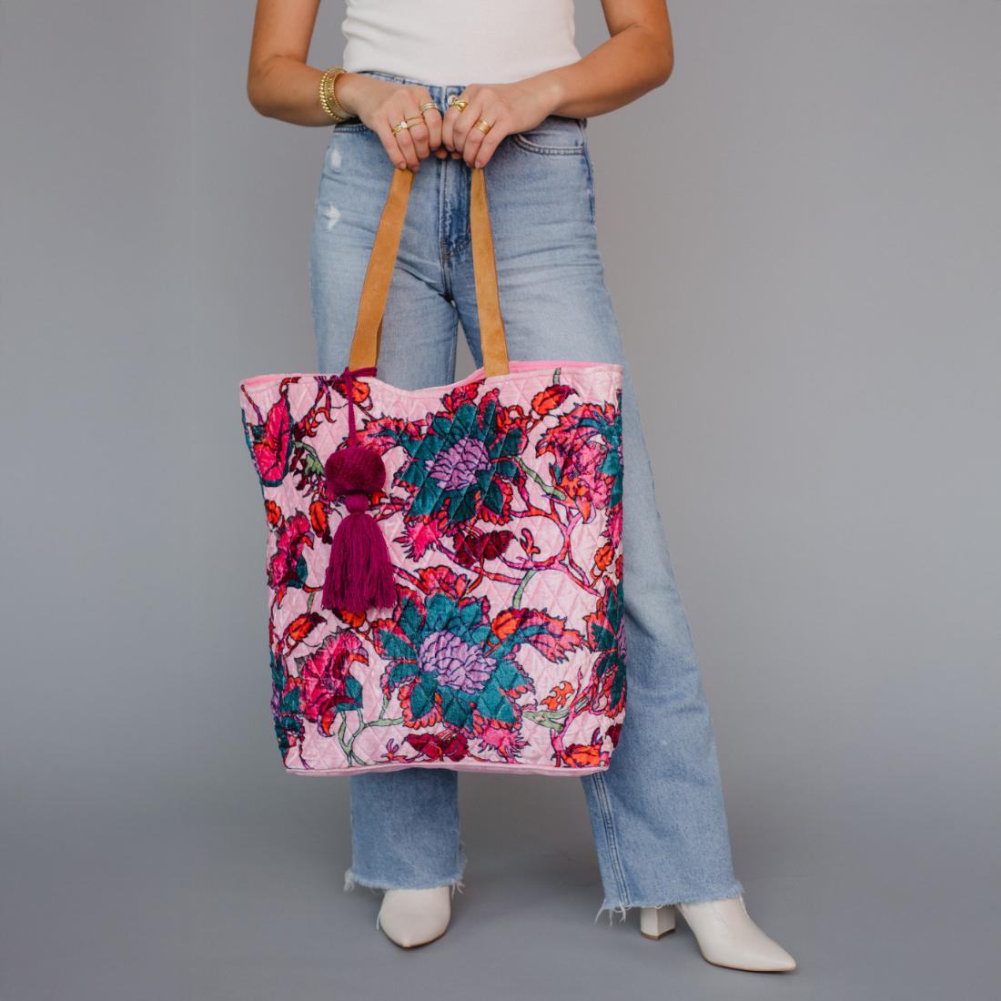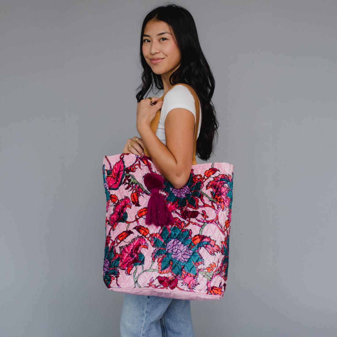Make a bold statement with our velvet floral tote bag that brings luxurious texture and vibrant style to every journey. This eye-catching bag is perfect for weekend getaways, overnight trips, or any adventure where you want to travel in style. The secure snap closure at the top protects your belongings, while thoughtful interior organization includes a zippered pocket for valuables and two small open pockets to keep essentials easily accessible. Spacious enough to hold your travel necessities, this velvet tote adds a touch of elegance and personality to every trip.