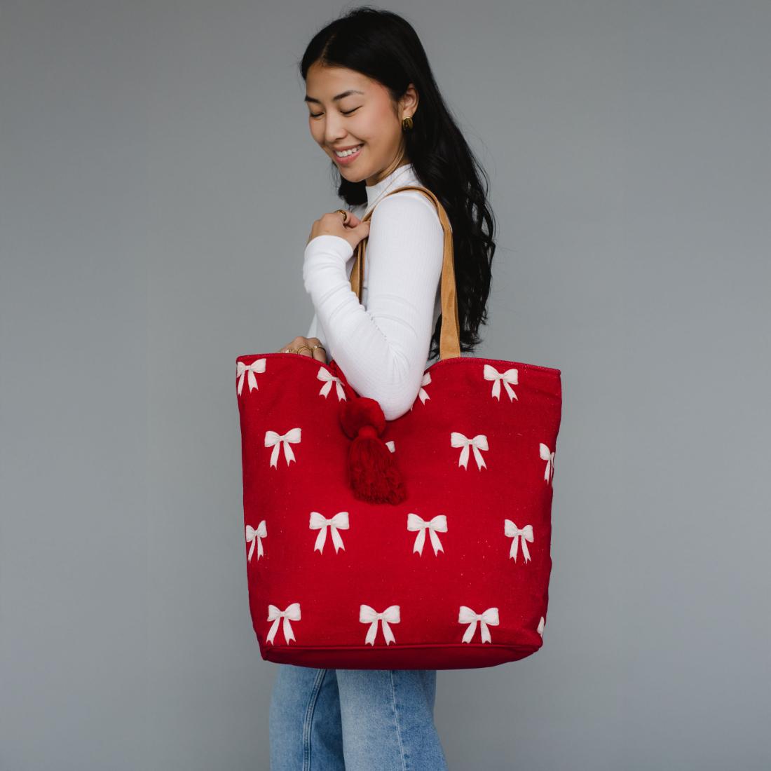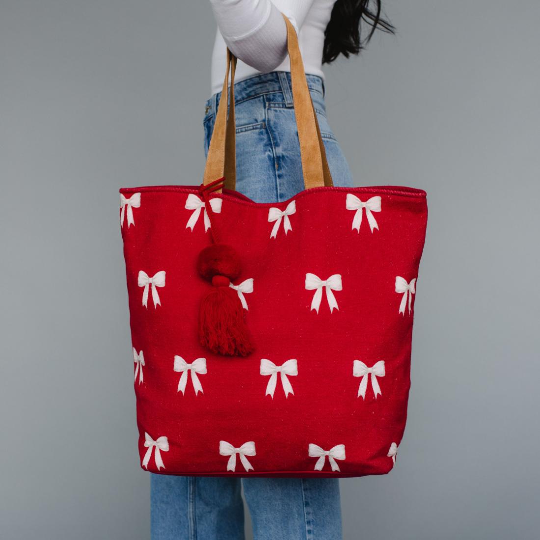 Make a festive statement with our red tote bag featuring a trendy white bow design on the front. This holiday-ready tote combines seasonal style with everyday functionality, perfect for holiday shopping, winter outings, or daily essentials.Thoughtfully designed interior organization includes a zippered pocket for valuables and two small open pockets for quick-access items like your phone, keys, and cosmetics. The playful pom tassel and bow detail add whimsical charm to this practical bag, making it the perfect accessory for those who love to celebrate the season in style.