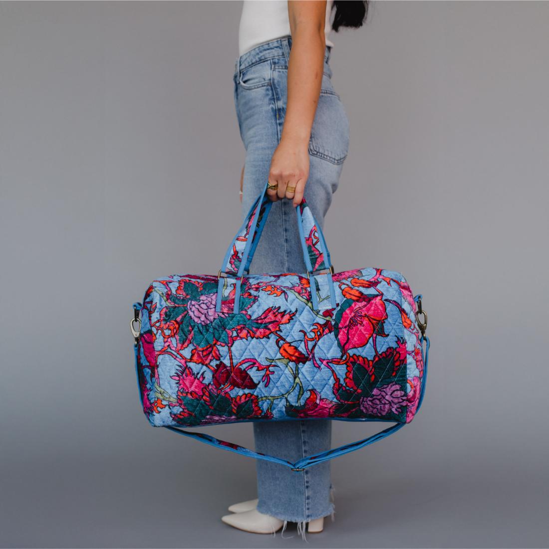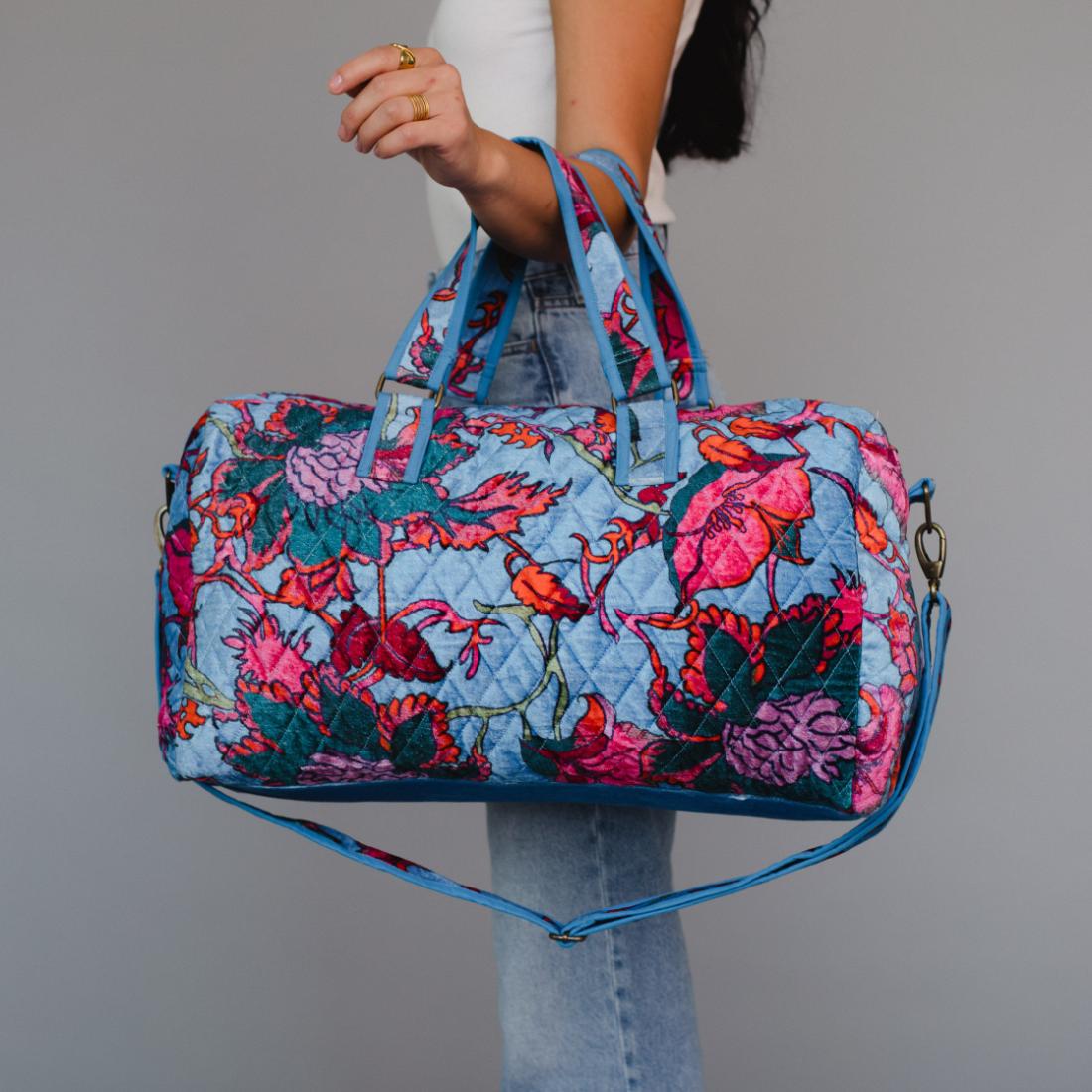 Make a bold statement with our velvet floral duffel bag that brings luxurious texture and vibrant style to every journey. This eye-catching weekender is perfect for weekend getaways, overnight trips, or any adventure where you want to travel in style. The secure zipper closure at the top protects your belongings, while thoughtful interior organization includes a zippered pocket for valuables and two small open pockets to keep essentials easily accessible. Spacious enough to hold your travel necessities, this velvet duffel adds a touch of elegance and personality to every trip.