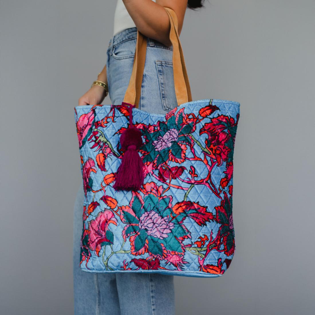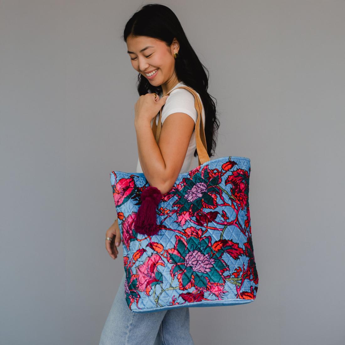 Make a bold statement with our velvet floral tote bag that brings luxurious texture and vibrant style to every journey. This eye-catching bag is perfect for weekend getaways, overnight trips, or any adventure where you want to travel in style. The secure snap closure at the top protects your belongings, while thoughtful interior organization includes a zippered pocket for valuables and two small open pockets to keep essentials easily accessible. Spacious enough to hold your travel necessities, this velvet tote adds a touch of elegance and personality to every trip.