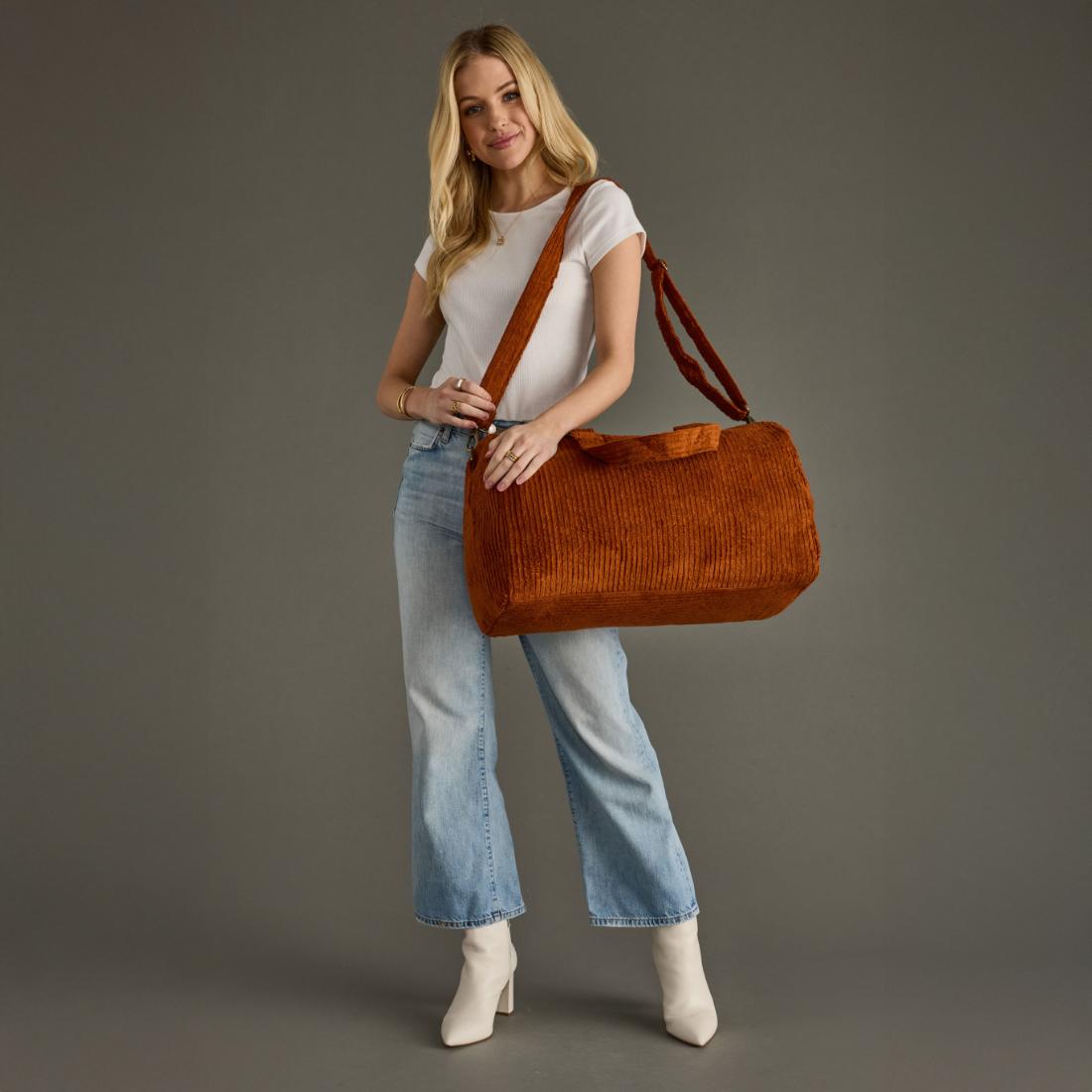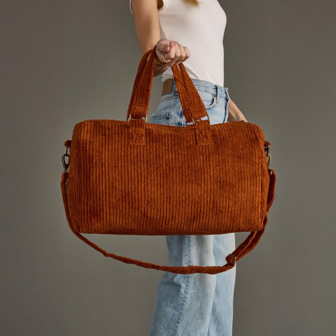 Elevate your travel style with our corduroy duffel bag that combines retro texture with modern functionality. This stylish weekender features rich corduroy fabric that adds charm to any adventure, whether you're heading to the mountains for a ski trip or packing for a weekend getaway. The secure zipper closure at the top protects your belongings, while thoughtful interior organization includes a zippered pocket for valuables and two small open pockets to keep essentials within easy reach. Spacious enough to hold clothing, shoes, and travel necessities, yet compact enough for easy transport, this corduroy duffel brings cozy texture and timeless style to every journey.