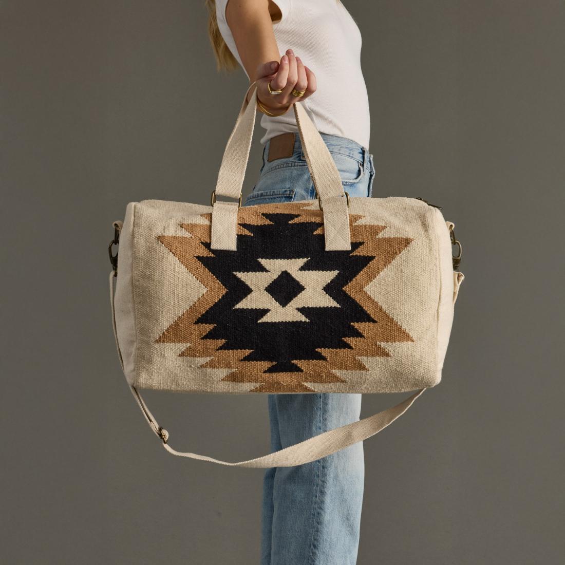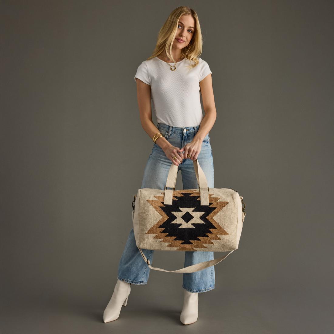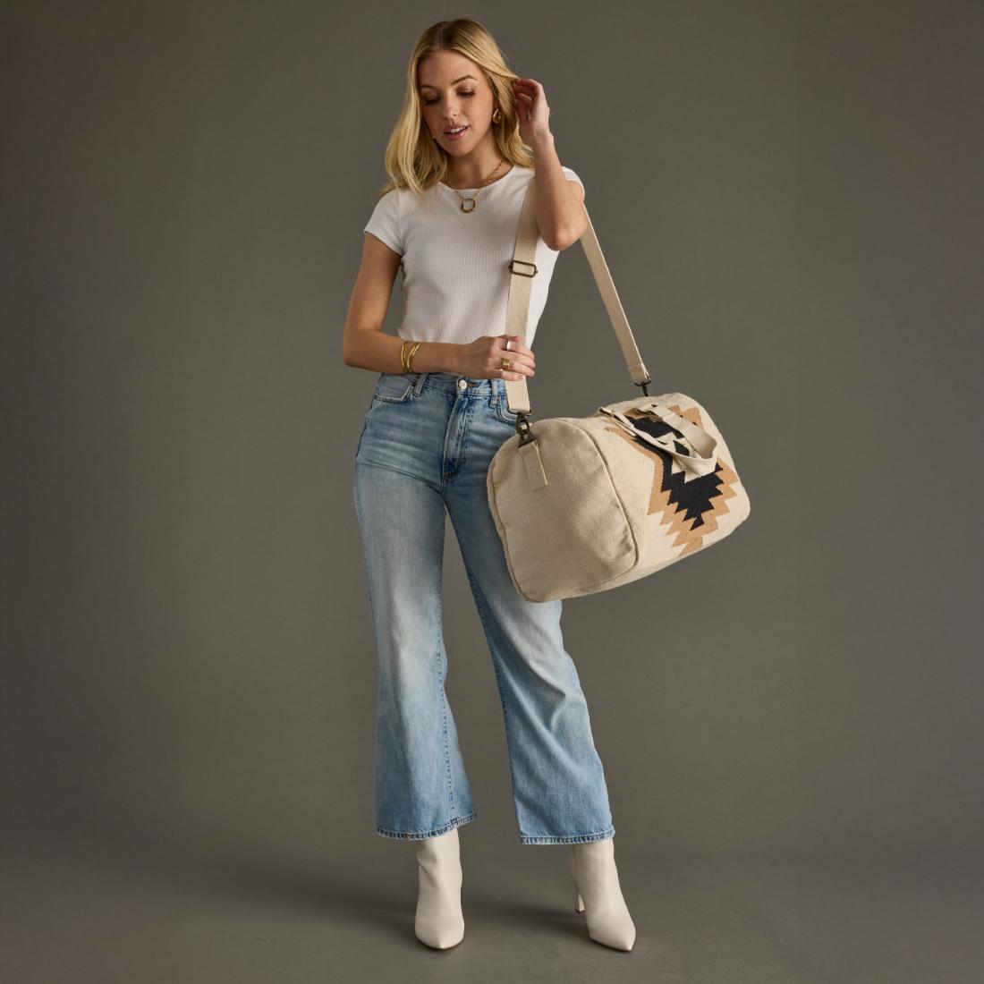 Travel in style with our duffel bag featuring subtle western-inspired details that add character to every destination. This versatile weekender combines timeless design with modern functionality, making it perfect for weekend getaways or spontaneous adventures. The secure zipper closure at the top keeps your belongings protected, while thoughtful interior organization includes a zippered pocket for valuables and two small open pockets to keep essentials easily accessible. Spacious enough to pack clothing, shoes, and travel necessities, yet compact enough for easy storage, this neutral-toned duffel transitions seamlessly from mountain retreats to city escapes.