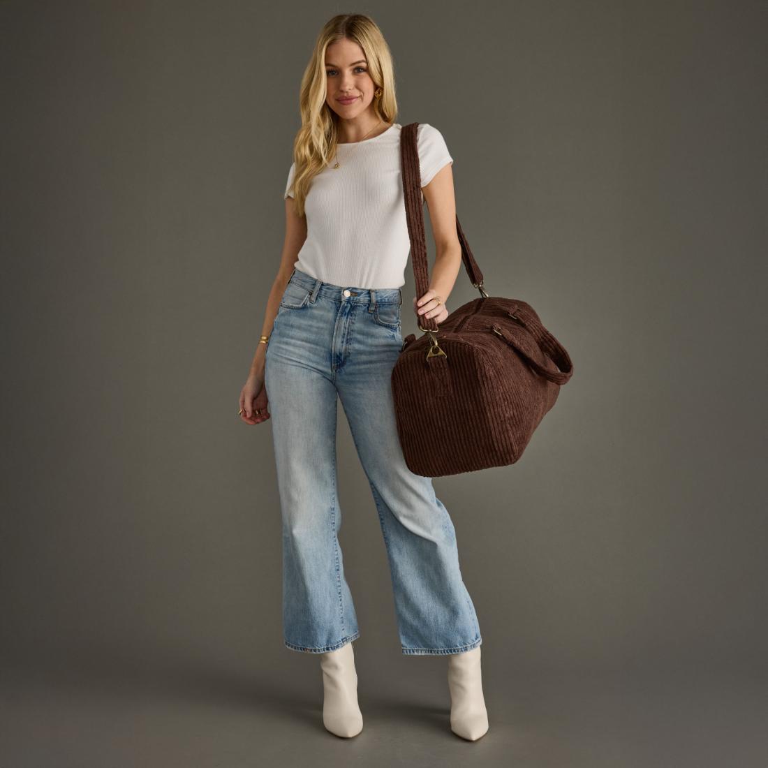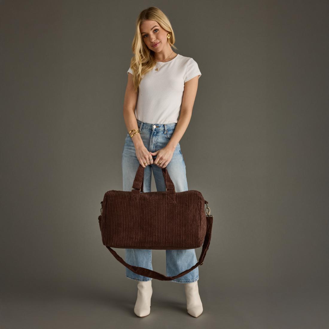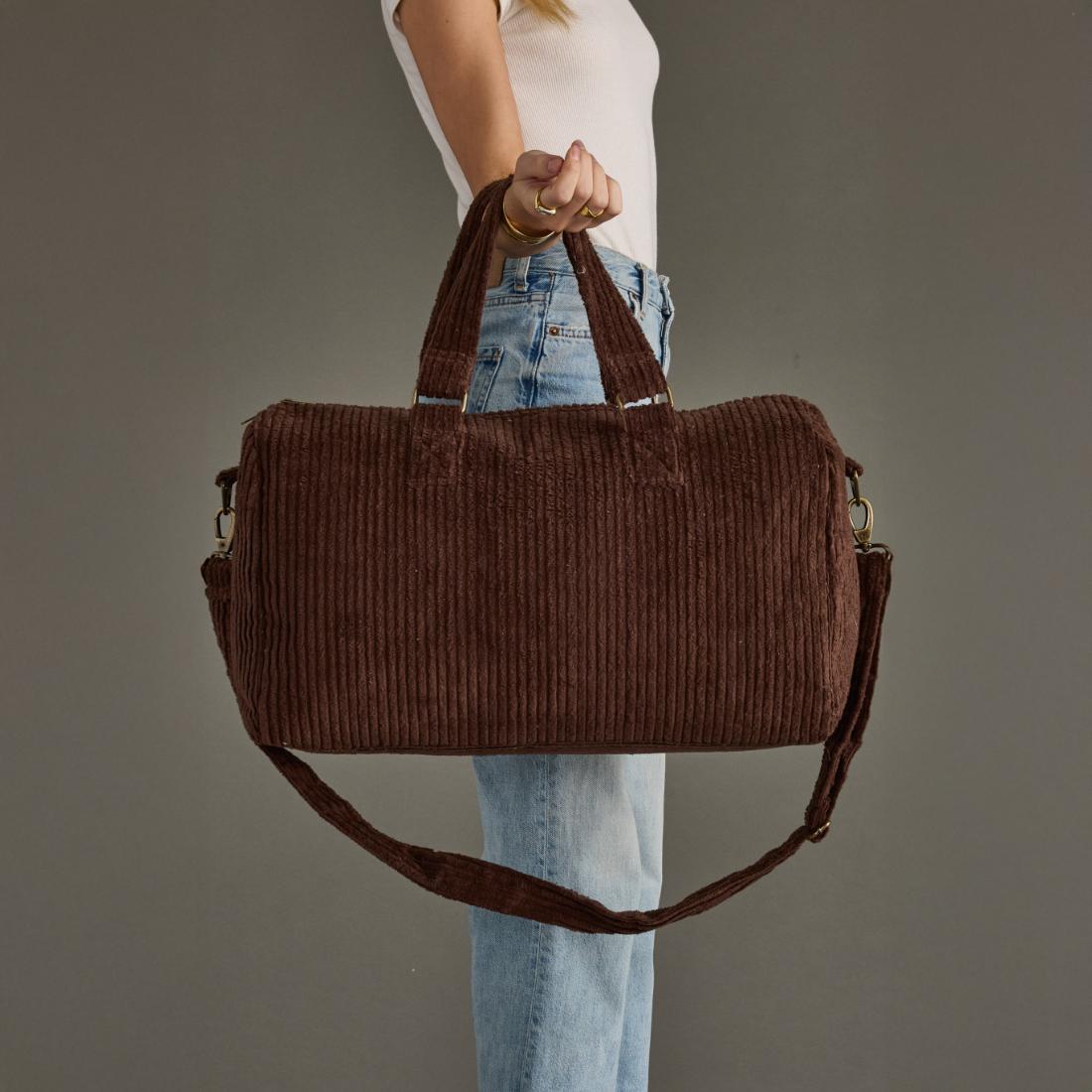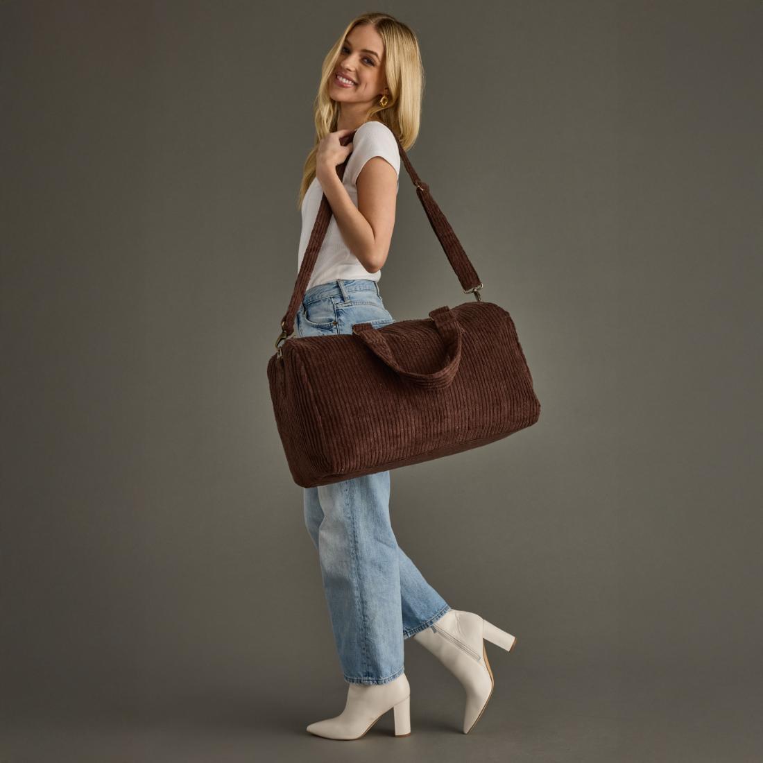 Elevate your travel style with our corduroy duffel bag that combines retro texture with modern functionality. This stylish weekender features rich corduroy fabric that adds charm to any adventure, whether you're heading to the mountains for a ski trip or packing for a weekend getaway. The secure zipper closure at the top protects your belongings, while thoughtful interior organization includes a zippered pocket for valuables and two small open pockets to keep essentials within easy reach. Spacious enough to hold clothing, shoes, and travel necessities, yet compact enough for easy transport, this corduroy duffel brings cozy texture and timeless style to every journey.