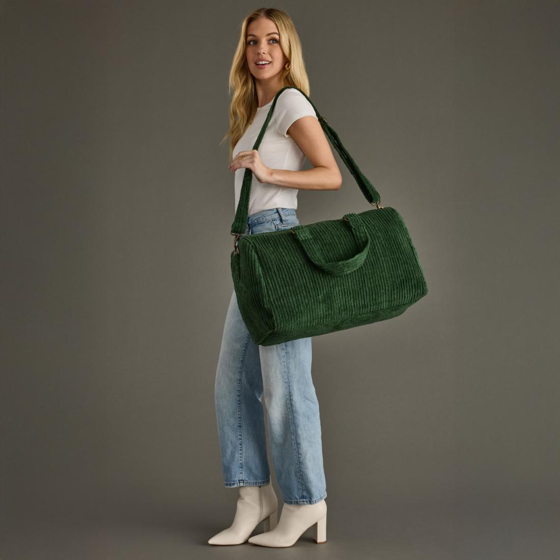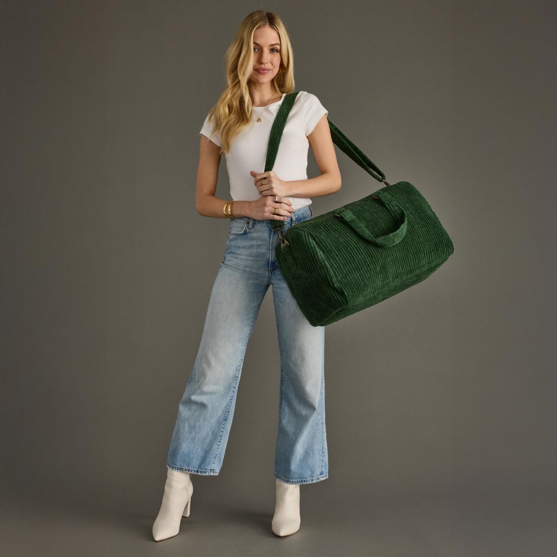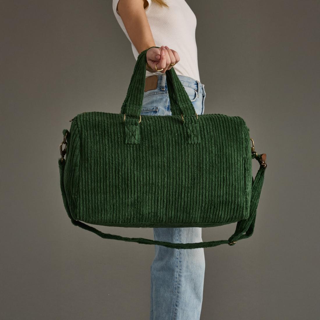 - Dark green corduroy duffel