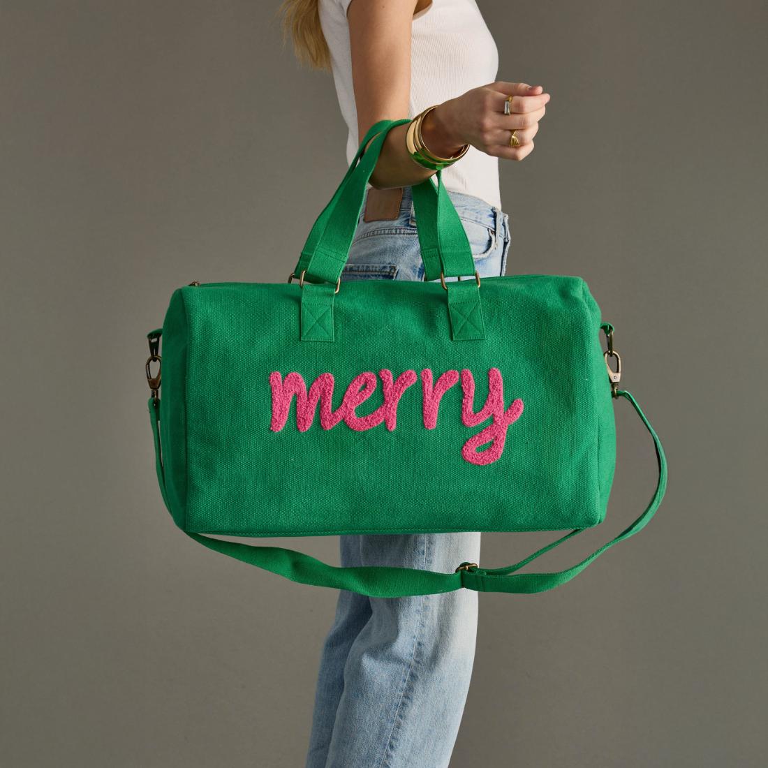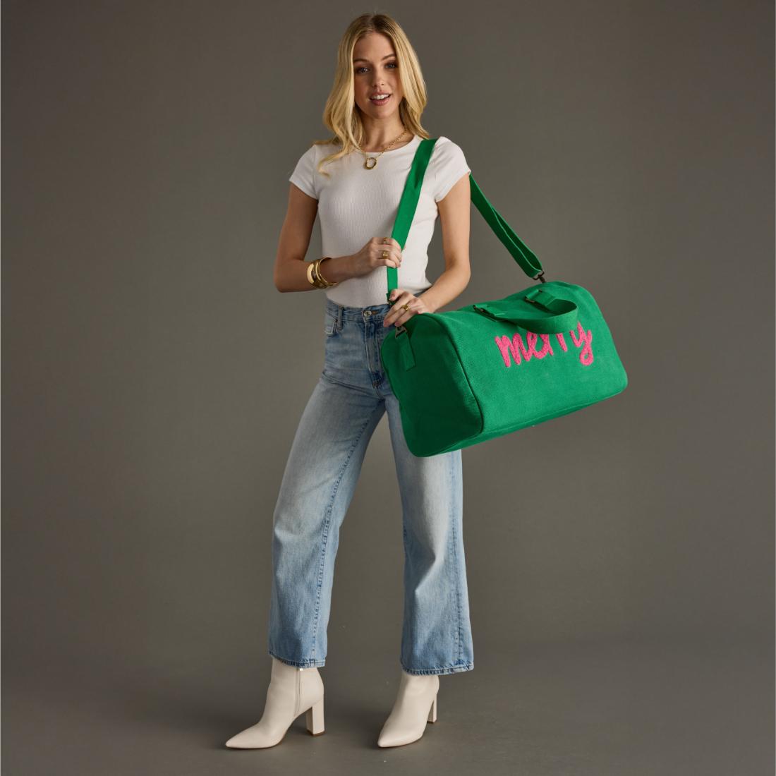 Pack your holiday essentials in style with our green duffel bag featuring playful pink "Merry" textured text on the front. This festive travel companion combines cheerful holiday vibes with practical functionality, making it perfect for weekend getaways or holiday travels. Spacious enough for all your essentials yet compact enough for easy transport, this bag is the perfect blend of holiday cheer and everyday practicality.