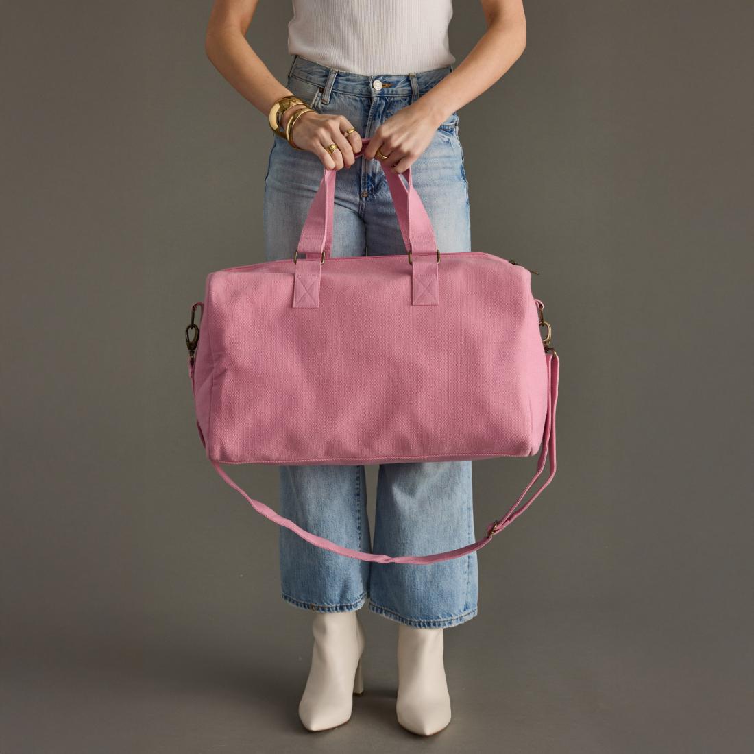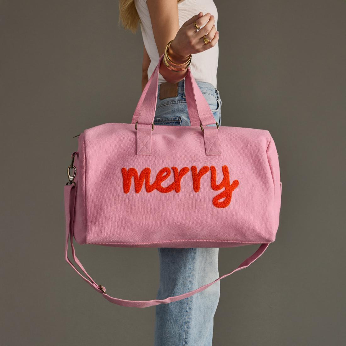 Pack your holiday essentials in style with our pink duffel bag featuring playful orange "Merry" textured text on the front. This festive travel companion combines cheerful holiday vibes with practical functionality, making it perfect for weekend getaways or holiday travels. Spacious enough for all your essentials yet compact enough for easy transport, this bag is the perfect blend of holiday cheer and everyday practicality.