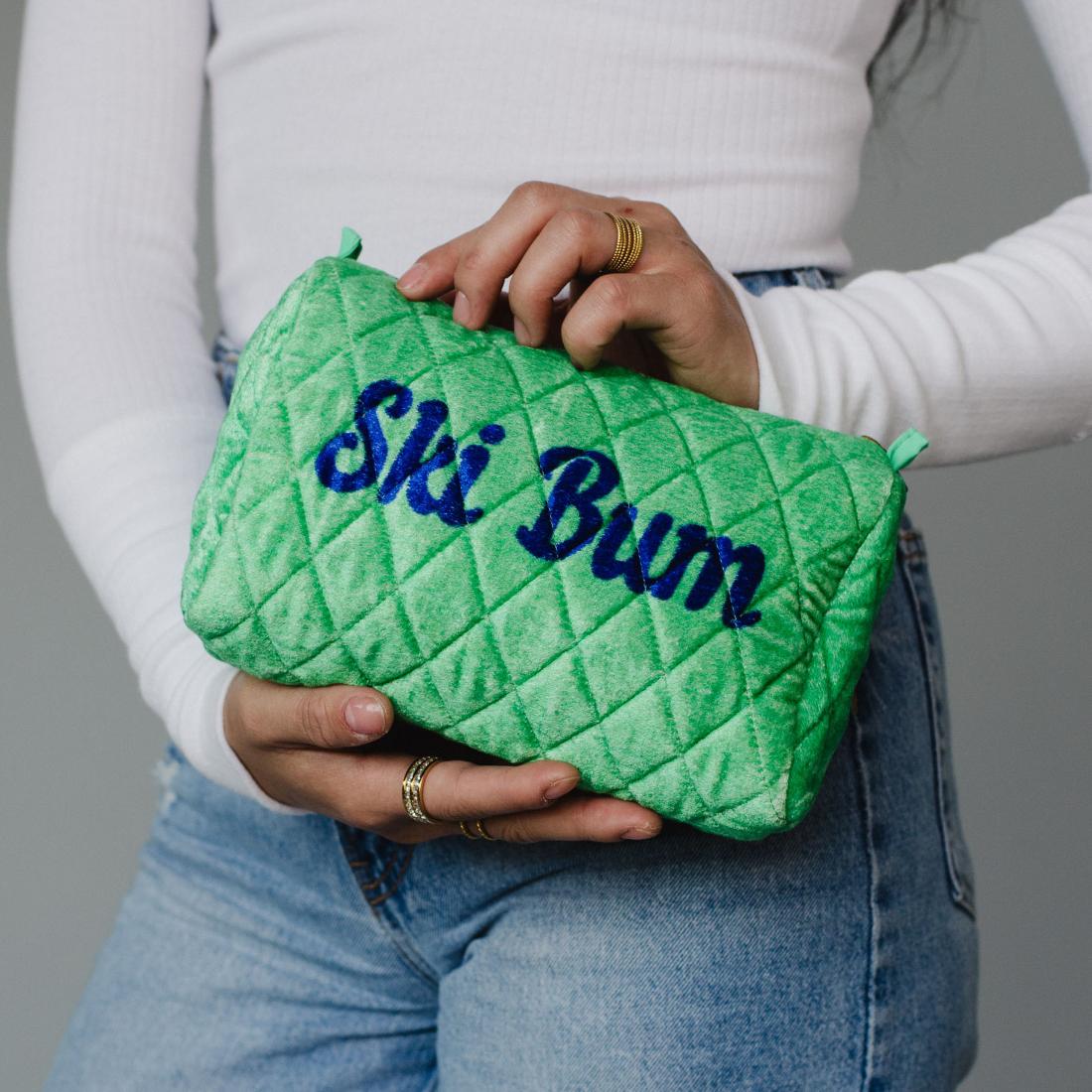 Embrace your mountain lifestyle with this green velvet quilted travel pouch featuring bold blue "Ski Bum" text on the front. This luxurious accessory is perfect for storing toiletries, cosmetics, ski essentials, or tech accessories whether you're heading to the slopes or organizing at home. Compact yet spacious enough for all your travel necessities, this versatile pouch fits easily into duffel bags, backpacks, or suitcases. Perfect for ski enthusiasts who appreciate both function and fun in their accessories.
