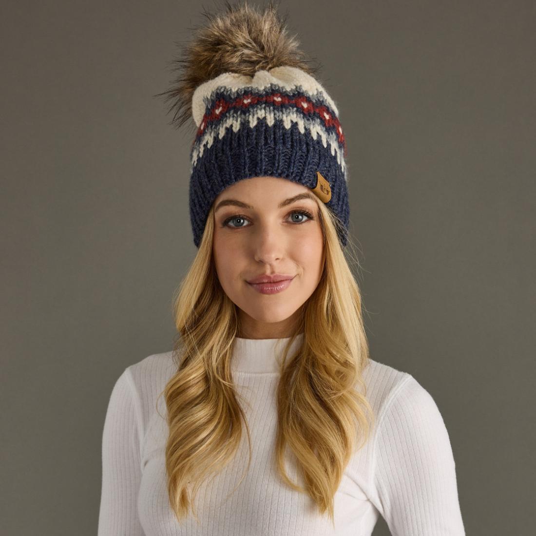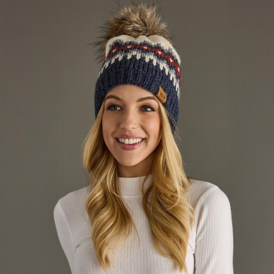 Elevate your winter style with this patterned knit pom hat. This eye-catching winter hat showcases intricate patterns that add visual interest and versatility to any cold-weather outfit. The one-size construction ensures a comfortable fit for most, making it an ideal gift or personal winter essential. Whether you're exploring snowy trails or running errands around town, this patterned pom hat delivers both warmth and standout style. Perfect for those who appreciate thoughtful design and cozy comfort in their winter accessories.