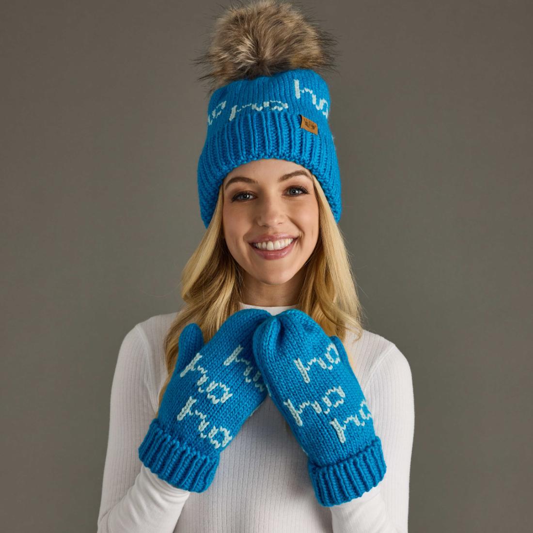 Spread holiday cheer with these blue mittens featuring playful light blue "ho ho ho" text throughout. These festive knit mittens combine cozy comfort with joyful style, making them perfect for holiday gatherings, winter outings, ski trips, or everyday cold-weather wear. The soft fleece lining keeps your hands warm and comfortable even on the chilliest days, and the one-size construction ensures a comfortable fit for most, making it an ideal gift for friends, family, or yourself.