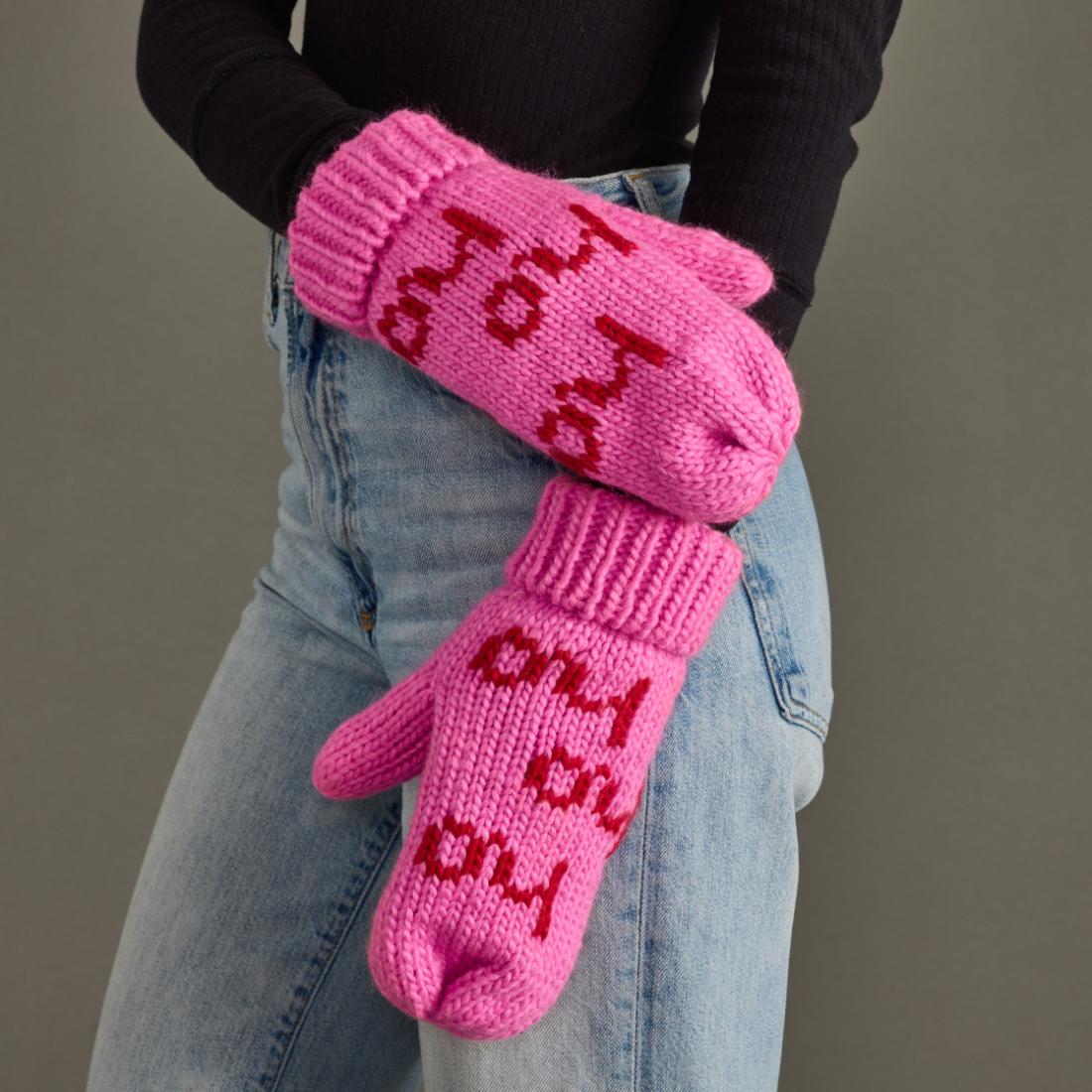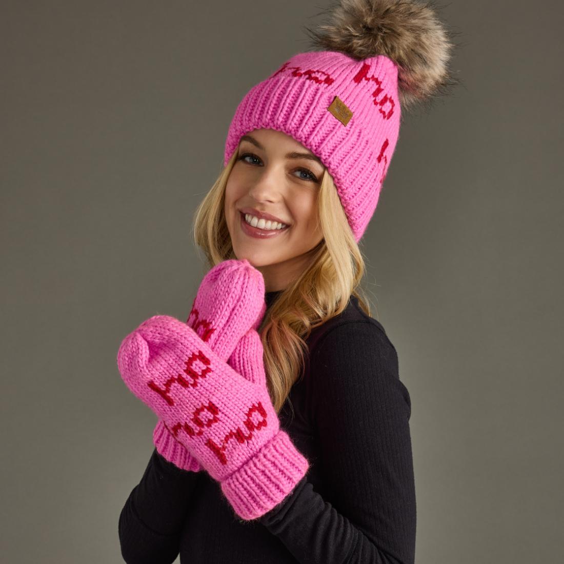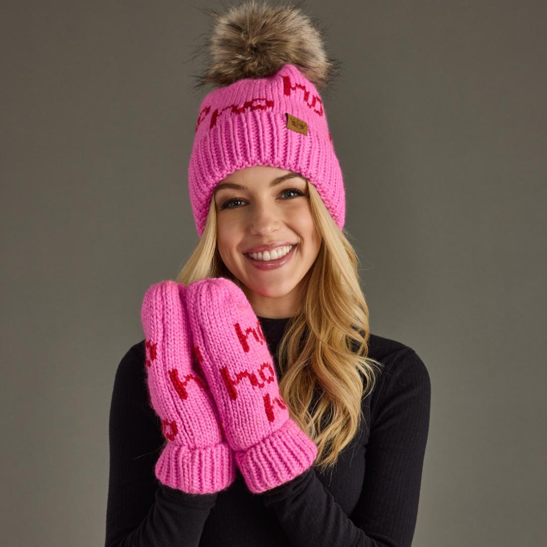 Spread holiday cheer with these bright pink mittens featuring playful red "ho ho ho" text throughout. These festive knit mittens combine cozy comfort with joyful style, making them perfect for holiday gatherings, winter outings, ski trips, or everyday cold-weather wear. The soft fleece lining keeps your hands warm and comfortable even on the chilliest days, and the one-size construction ensures a comfortable fit for most, making it an ideal gift for friends, family, or yourself.