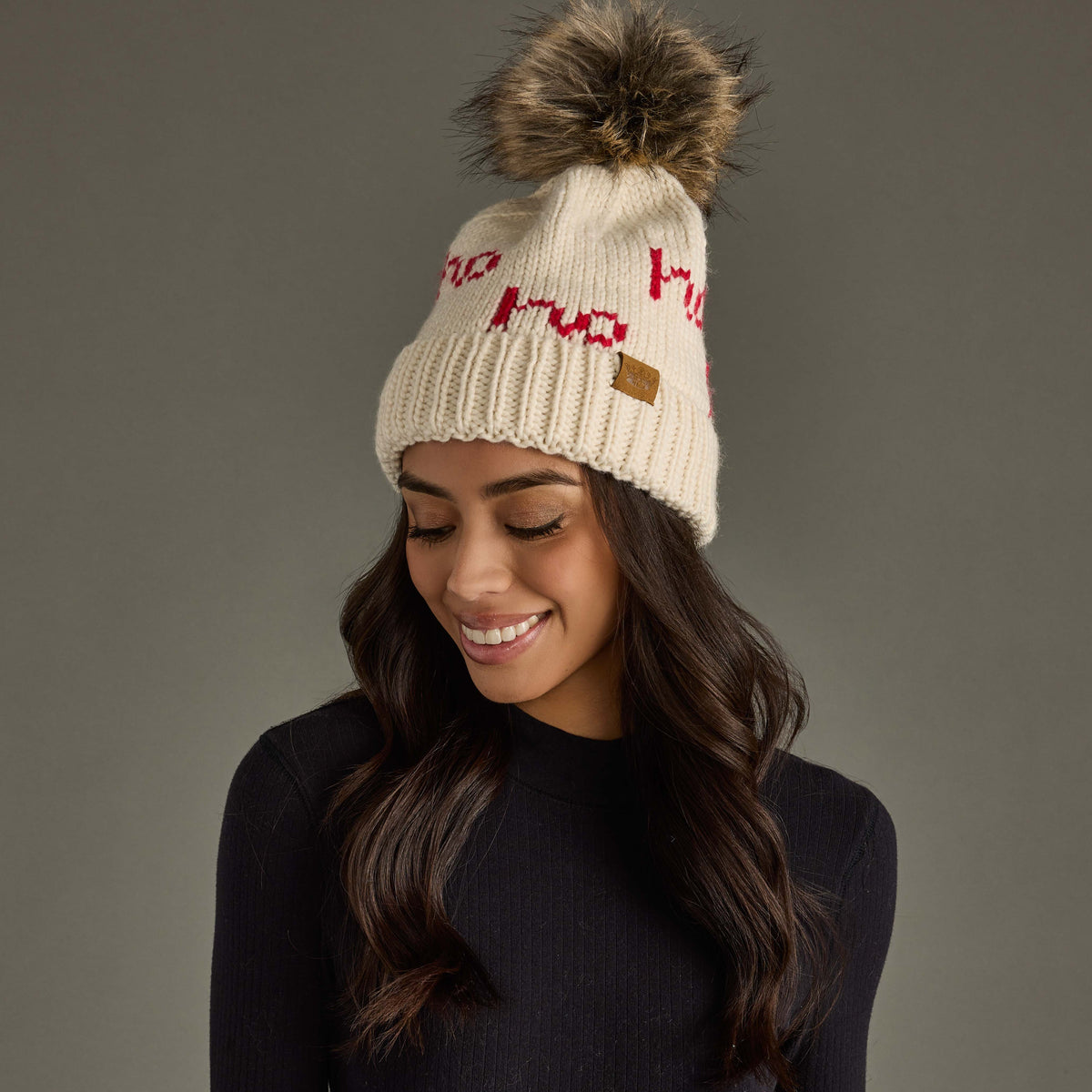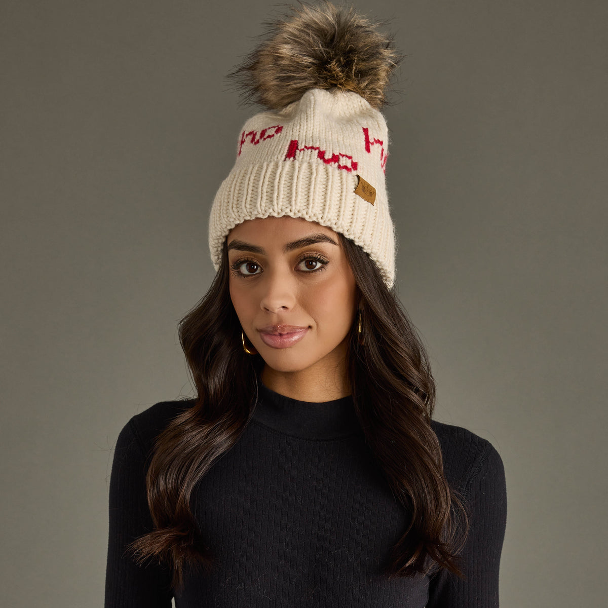 Spread holiday cheer with this beige pom hat featuring playful red "ho ho ho" text throughout. This festive knit hat combines cozy comfort with joyful style, making it perfect for holiday gatherings, winter outings, ski trips, or everyday cold-weather wear. The soft fleece lining keeps your head warm and comfortable even on the chilliest days, and the one-size construction ensures a comfortable fit for most, making it an ideal gift for friends, family, or yourself.