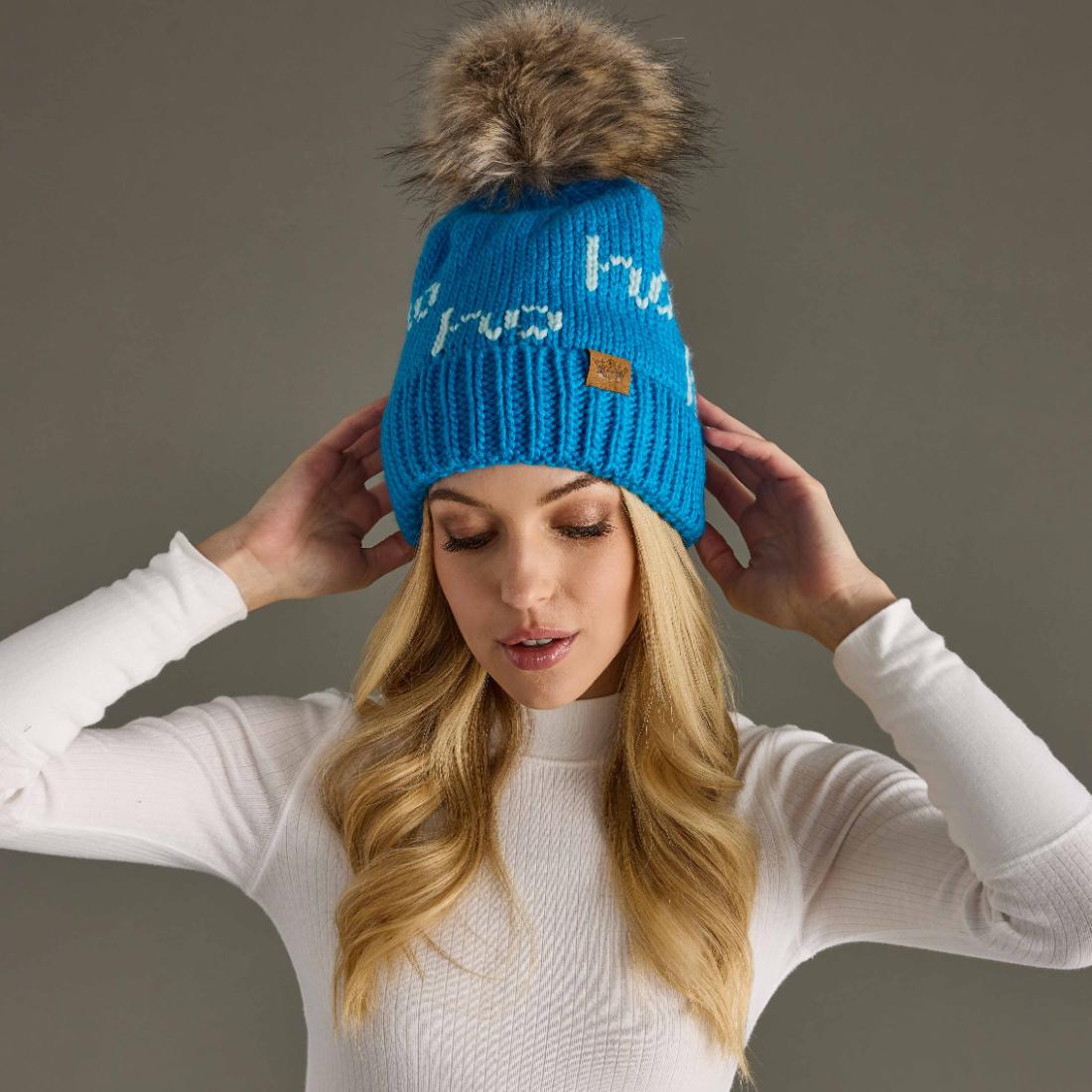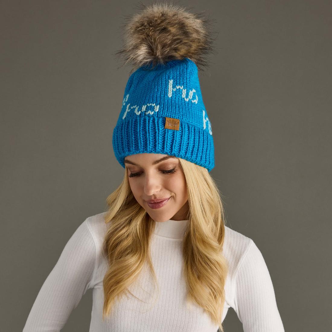 Spread holiday cheer with this blue pom hat featuring playful light blue "ho ho ho" text throughout. This festive knit hat combines cozy comfort with joyful style, making it perfect for holiday gatherings, winter outings, ski trips, or everyday cold-weather wear. The soft fleece lining keeps your head warm and comfortable even on the chilliest days, and the one-size construction ensures a comfortable fit for most, making it an ideal gift for friends, family, or yourself.