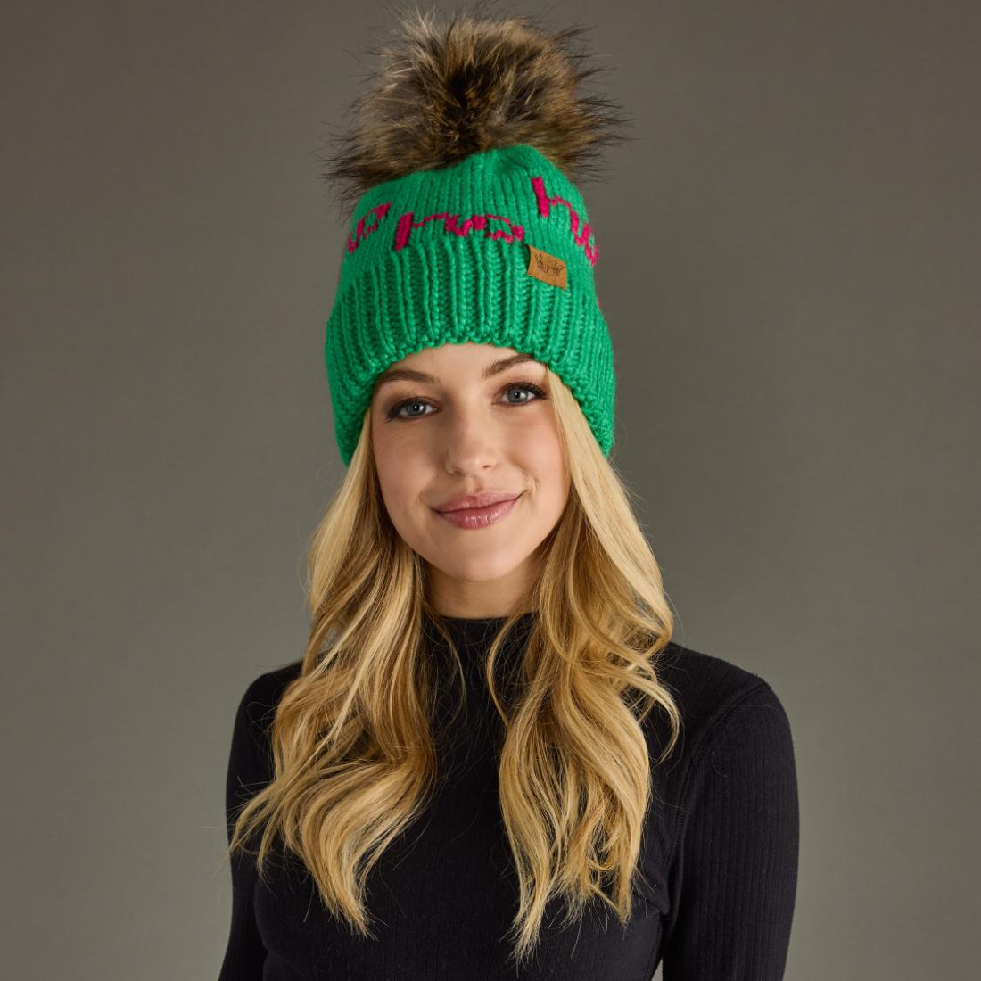 Spread holiday cheer with this green pom hat featuring playful pink "ho ho ho" text throughout. This festive knit hat combines cozy comfort with joyful style, making it perfect for holiday gatherings, winter outings, ski trips, or everyday cold-weather wear. The soft fleece lining keeps your head warm and comfortable even on the chilliest days, and the one-size construction ensures a comfortable fit for most, making it an ideal gift for friends, family, or yourself.