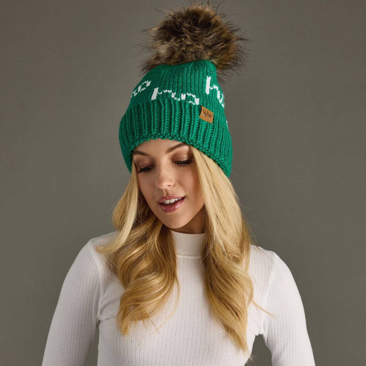 Spread holiday cheer with this green pom hat featuring classic white "ho ho ho" text throughout. This festive knit hat combines cozy comfort with joyful style, making it perfect for holiday gatherings, winter outings, ski trips, or everyday cold-weather wear. The soft fleece lining keeps your head warm and comfortable even on the chilliest days, and the one-size construction ensures a comfortable fit for most, making it an ideal gift for friends, family, or yourself.