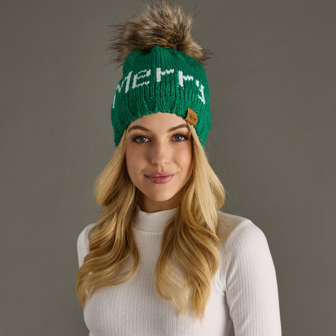 Celebrate the season in style with our green knit pom hat featuring classic white "Merry" text on the front. This festive winter hat is perfect for winter adventures, holiday parties, ski trips, or everyday cold-weather wear. The one-size construction ensures a comfortable fit for most, making it an ideal gift for loved ones or a treat for yourself. Whether you're shopping at the holiday market or simply braving winter weather, this pom hat delivers warmth, style, and festive vibes.