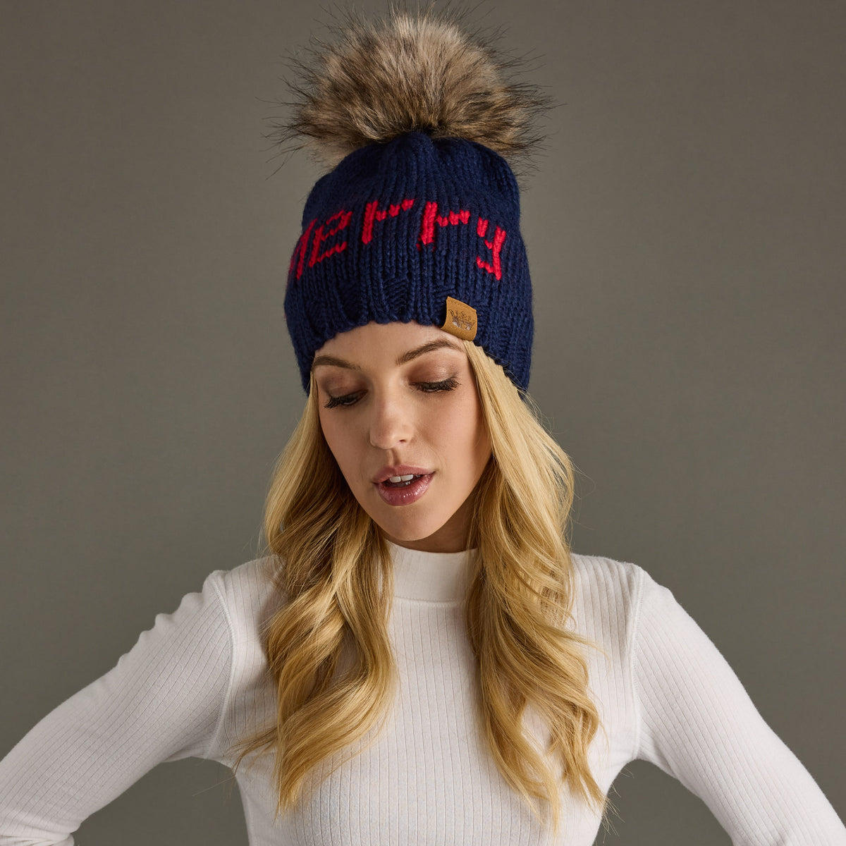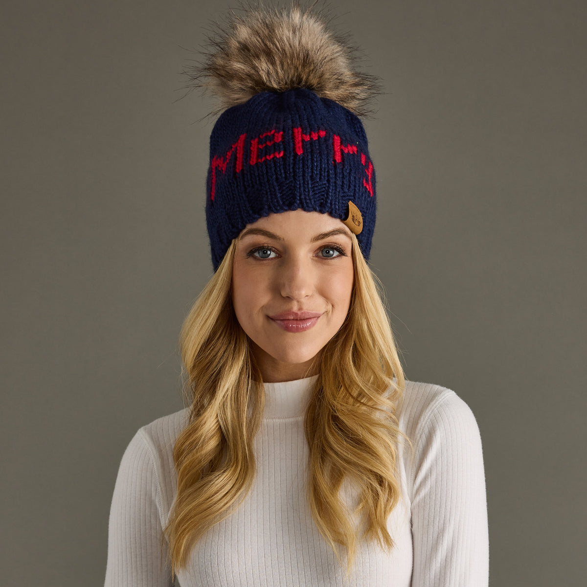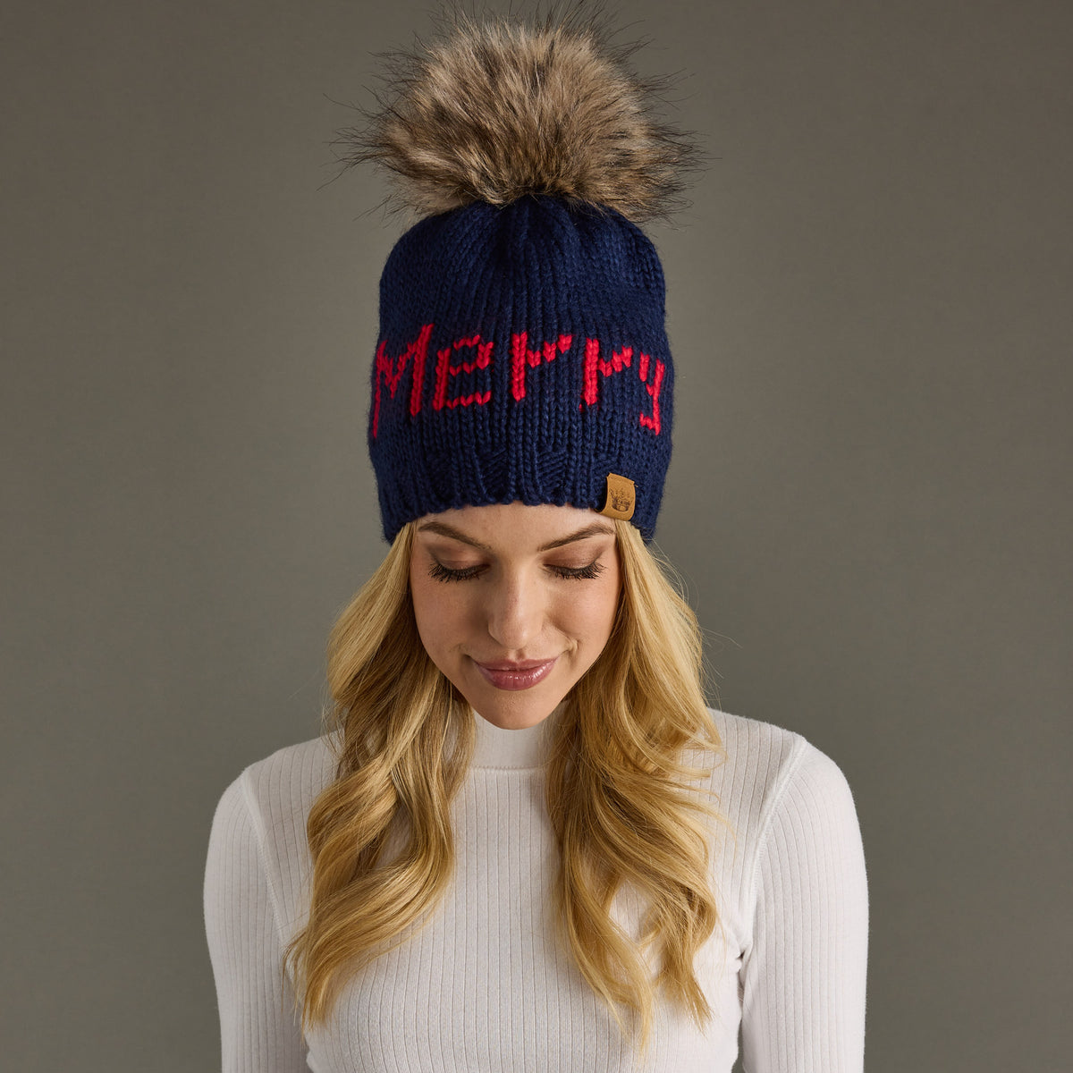 Celebrate the season in style with our navy knit pom hat featuring bold red "Merry" text on the front. This festive winter hat is perfect for winter adventures, holiday parties, ski trips, or everyday cold-weather wear. The one-size construction ensures a comfortable fit for most, making it an ideal gift for loved ones or a treat for yourself. Whether you're shopping at the holiday market or simply braving winter weather, this pom hat delivers warmth, style, and festive vibes.