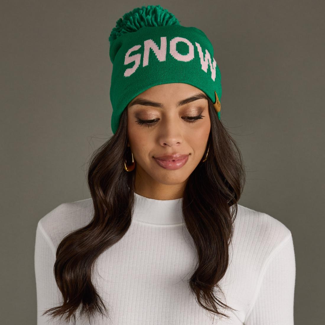 Embrace winter in style with our green knit pom hat featuring playful light pink "SNOW" text on the front. This cozy winter hat celebrates snow days and mountain adventures, making it perfect for skiing, snowboarding, winter hikes, or everyday cold-weather wear. The one-size construction ensures a comfortable fit for most, making it an ideal gift for snow lovers or a go-to accessory for your own winter wardrobe. Whether you're carving down the slopes, building snowmen, or simply enjoying a snowy day, this pom hat brings warmth, personality, and snow-loving spirit to every cold-weather adventure.