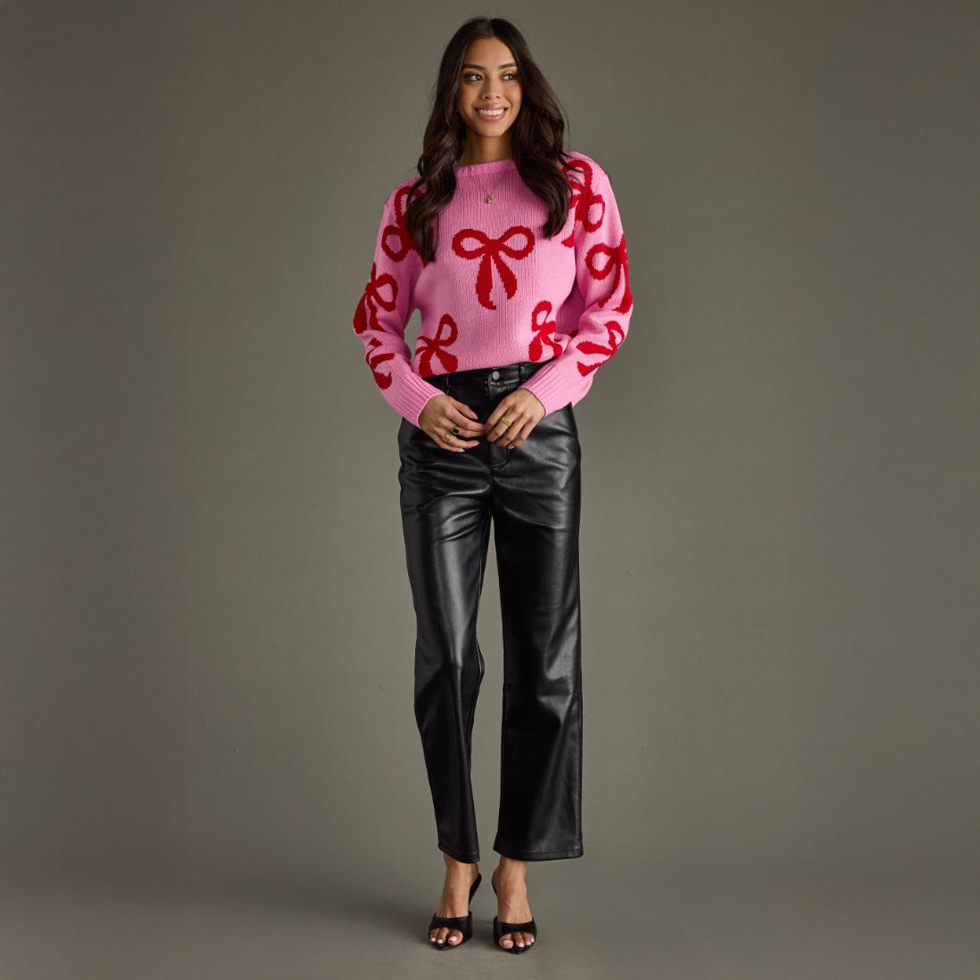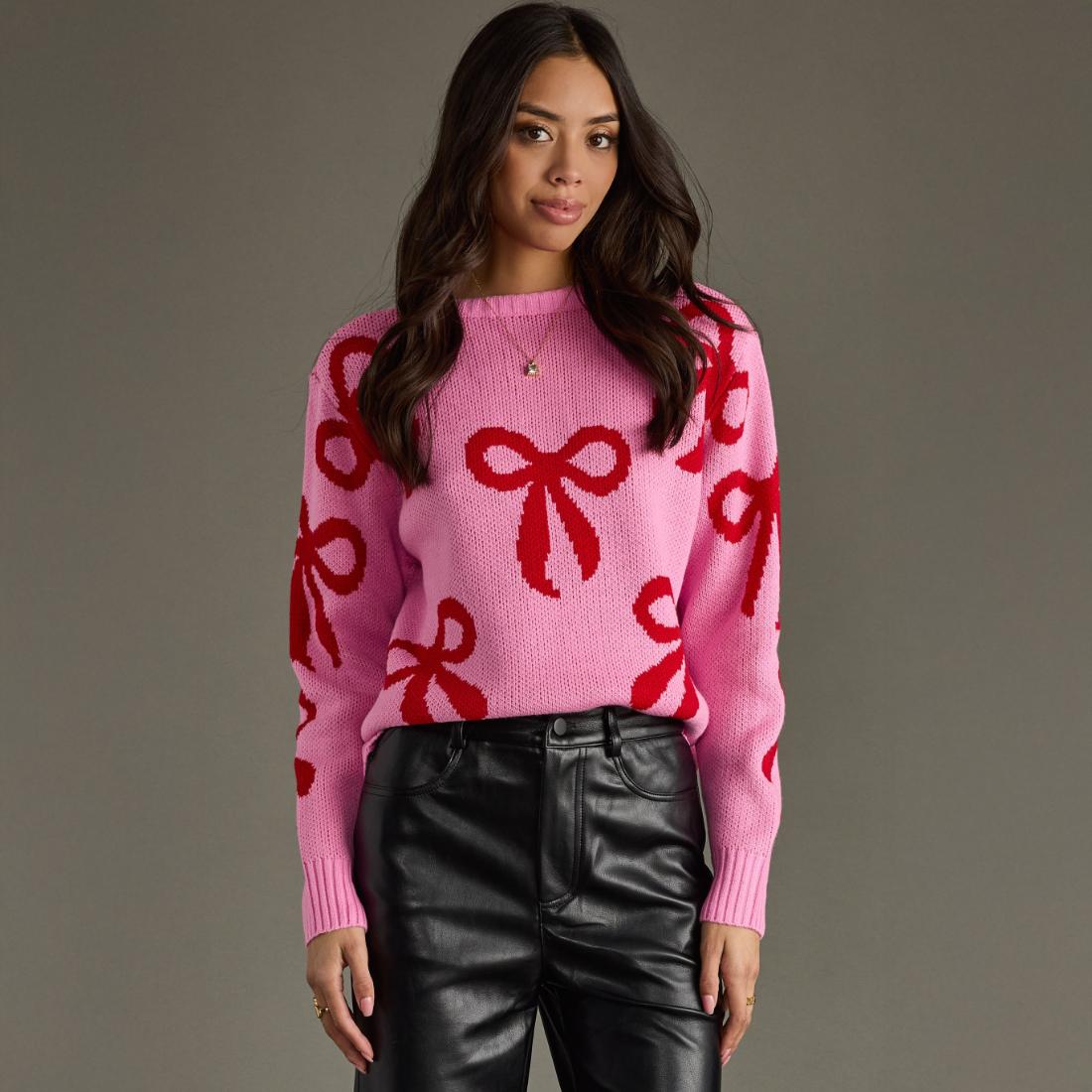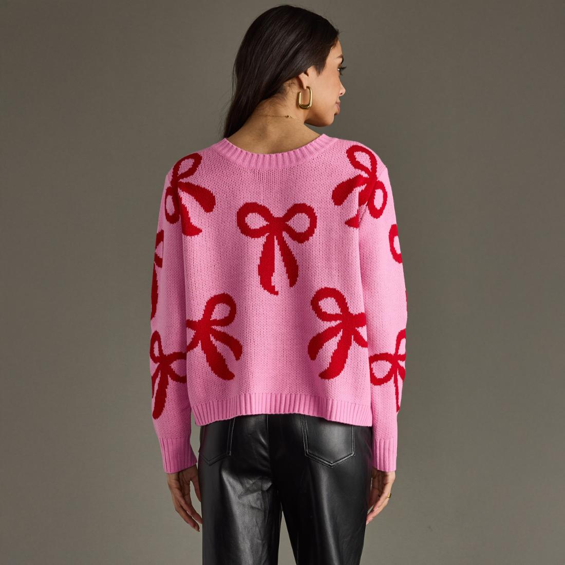 Add a touch of charm to your winter wardrobe with our pink knit sweater fashioned with delicate red bow designs on both the front and back. This sweet and stylish sweater brings feminine flair to cold-weather dressing, perfect for cozy days, casual outings, or relaxed weekends. The relaxed fit offers comfortable all-day wear without sacrificing style, while long sleeves provide essential warmth during chilly seasons. A wardrobe staple that combines comfort and character season after season.