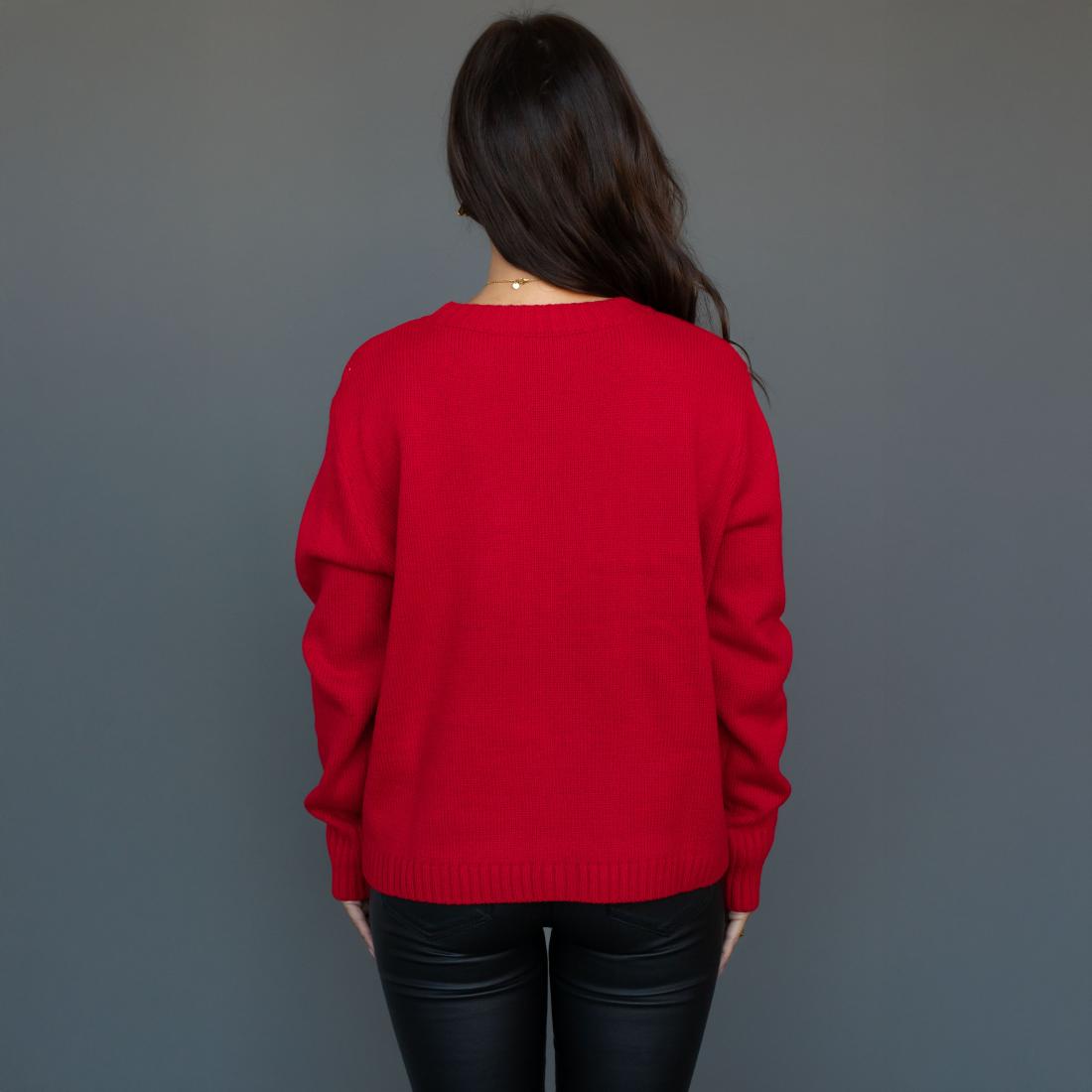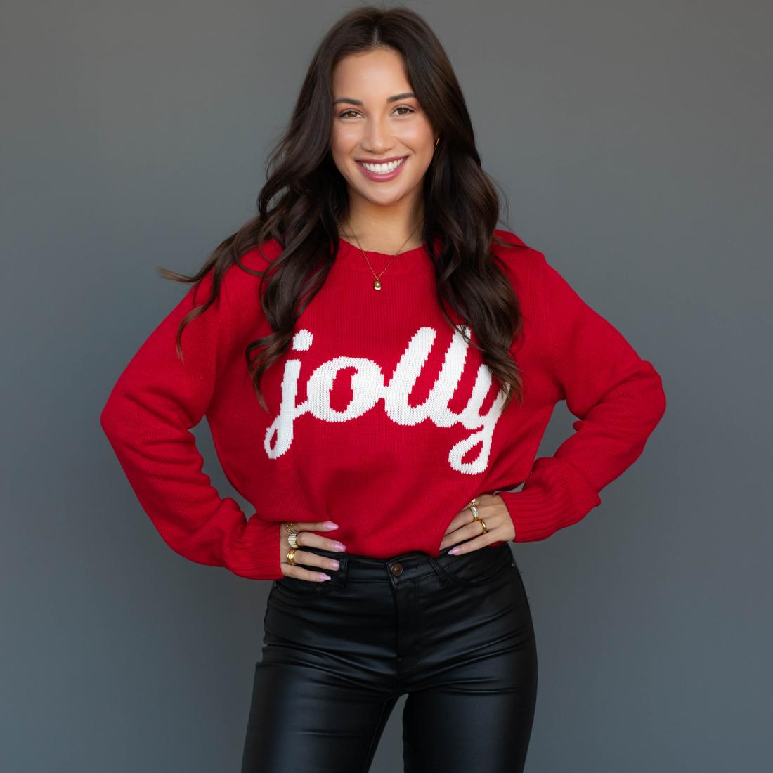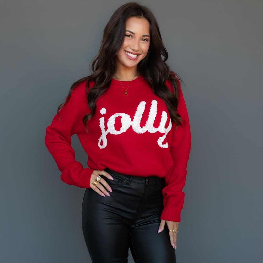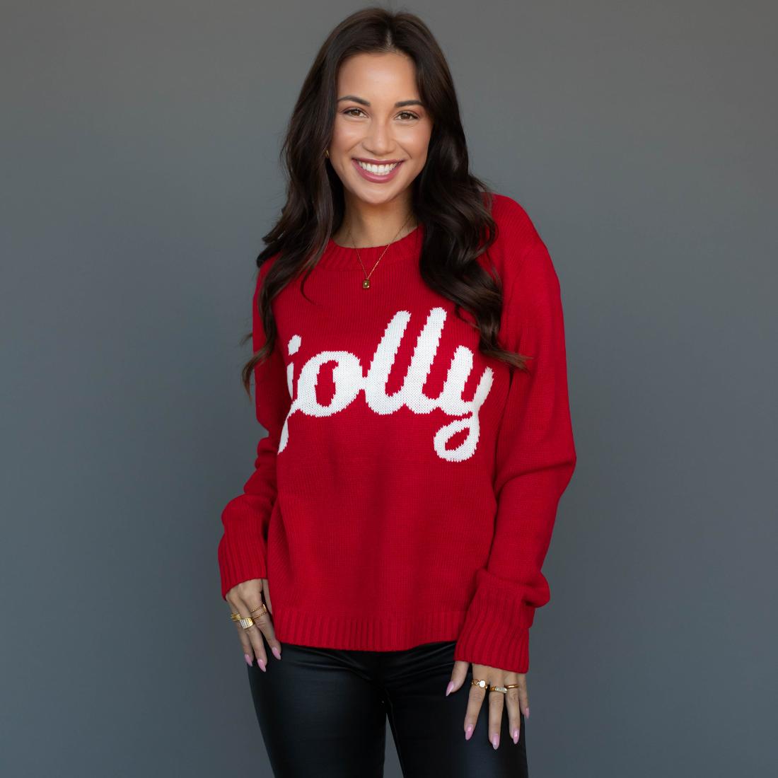 Embrace the spirit of the season with our red knit sweater featuring classic white "Jolly" text across the front. This cozy holiday essential combines festive style with everyday comfort, making it perfect for holiday parties, family gatherings, or casual winter outings. The relaxed fit ensures all-day wearability, while the long sleeves provide extra warmth during chilly days. A must-have for anyone who lives for the holiday season.