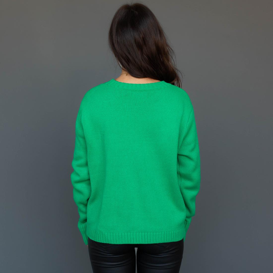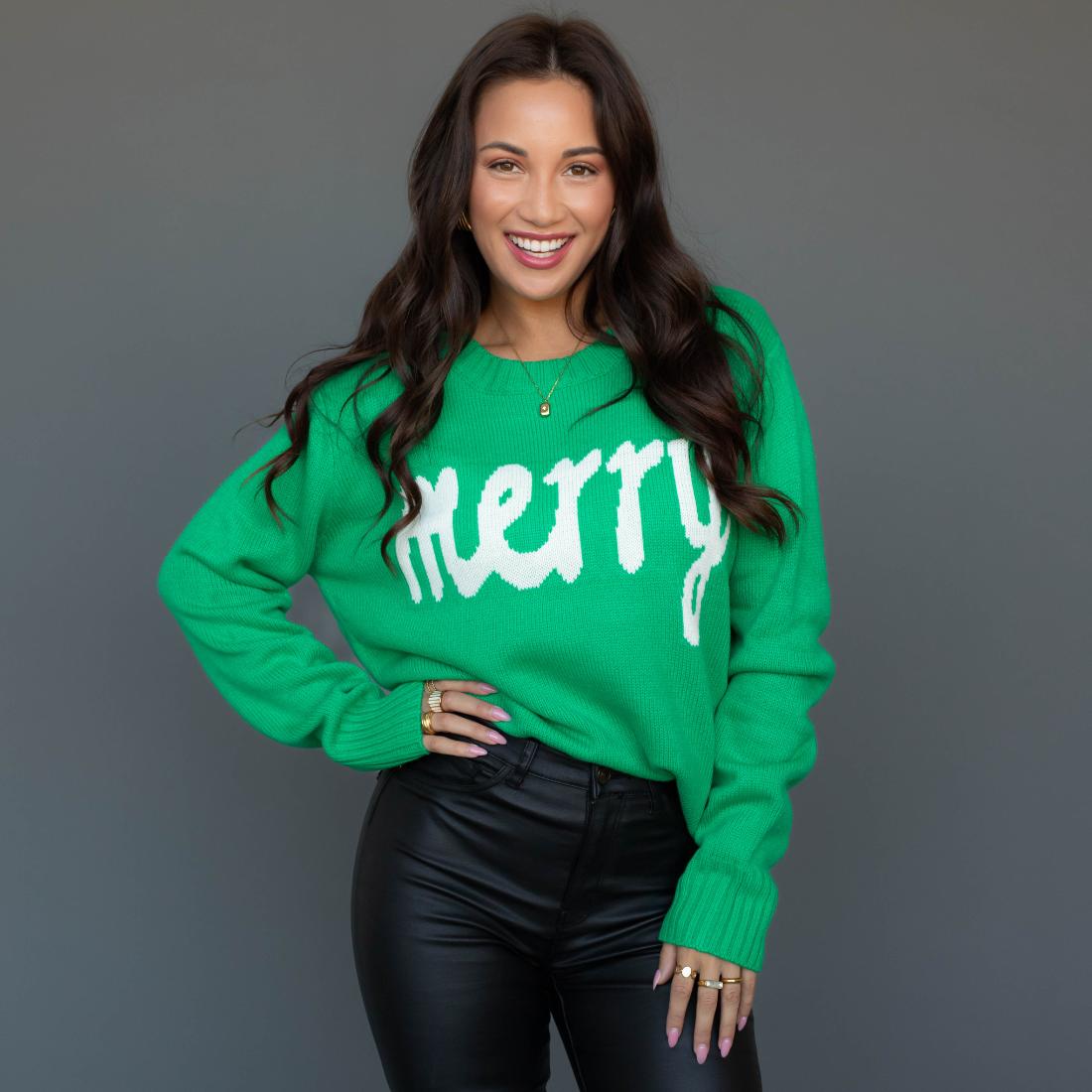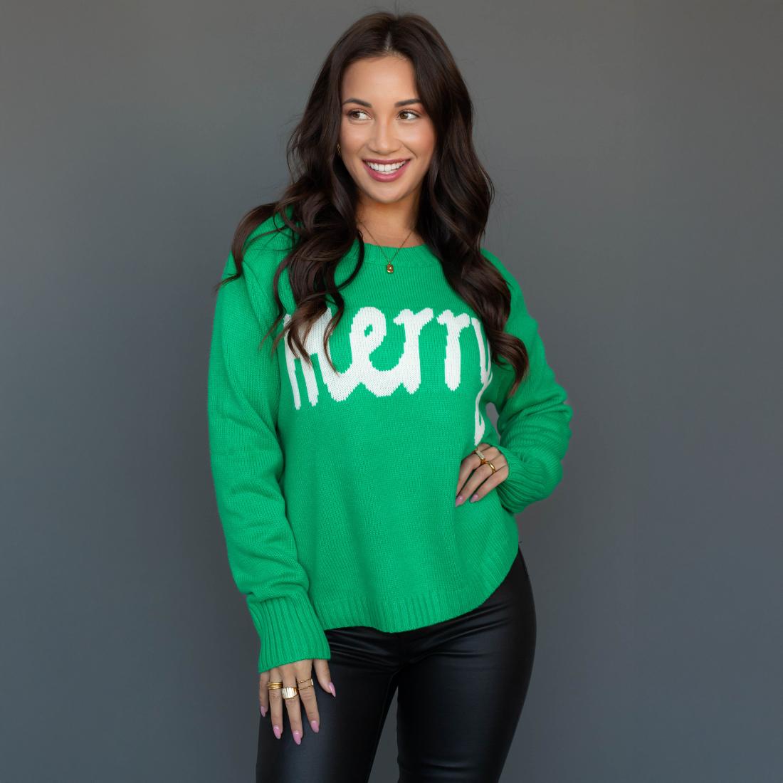Embrace the spirit of the season with our green knit sweater featuring classic white "Merry" text across the front. This cozy holiday essential combines festive style with everyday comfort, making it perfect for holiday parties, family gatherings, or casual winter outings. The relaxed fit ensures all-day wearability, while the long sleeves provide extra warmth during chilly days. A must-have for anyone who lives for the holiday season.