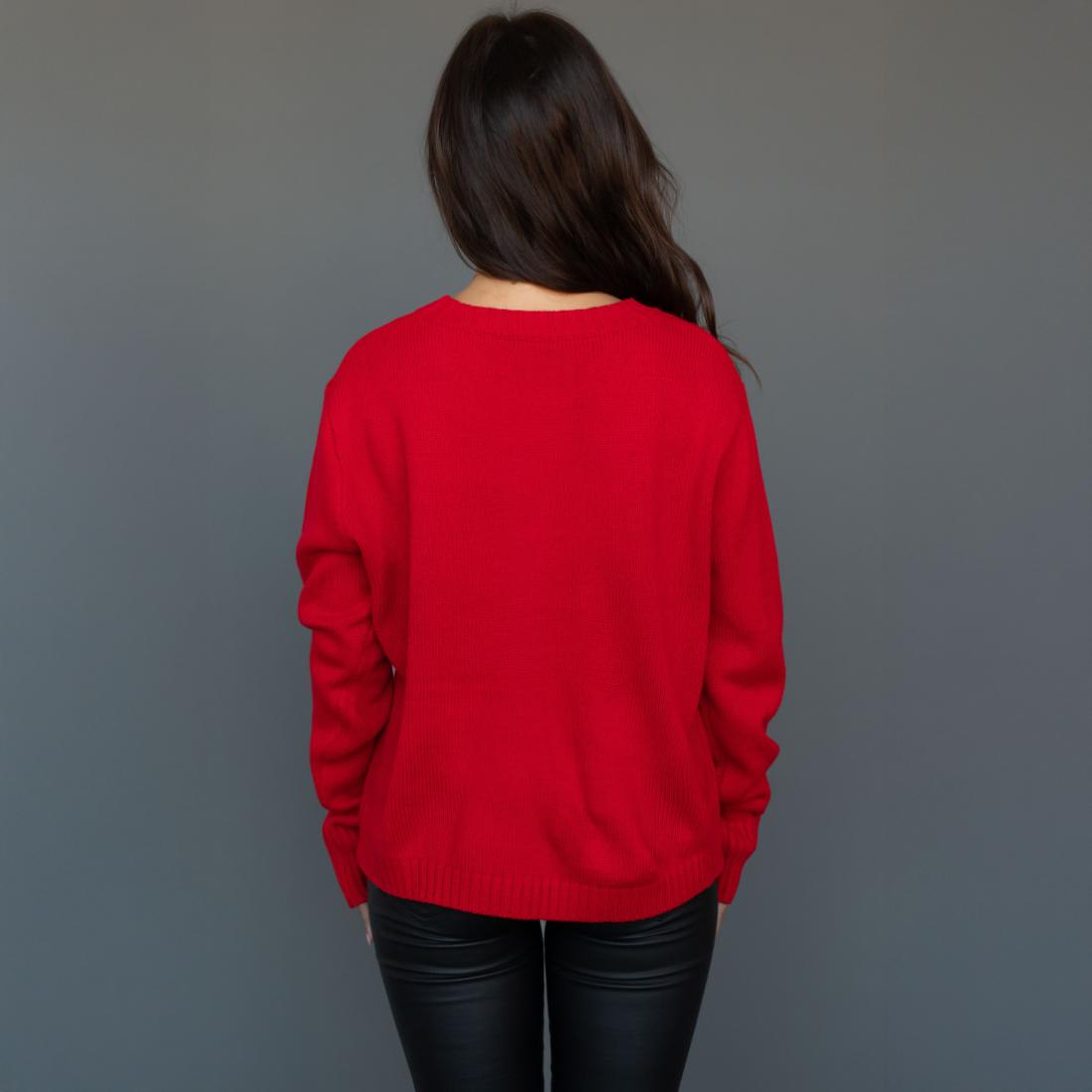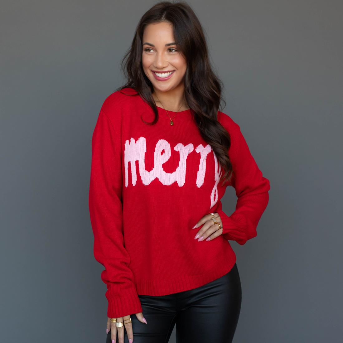 Embrace the spirit of the season with our red knit sweater featuring playful pink "Merry" text across the front. This cozy holiday essential combines festive style with everyday comfort, making it perfect for holiday parties, family gatherings, or casual winter outings. The relaxed fit ensures all-day wearability, while the long sleeves provide extra warmth during chilly days. A must-have for anyone who lives for the holiday season.