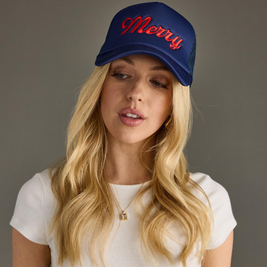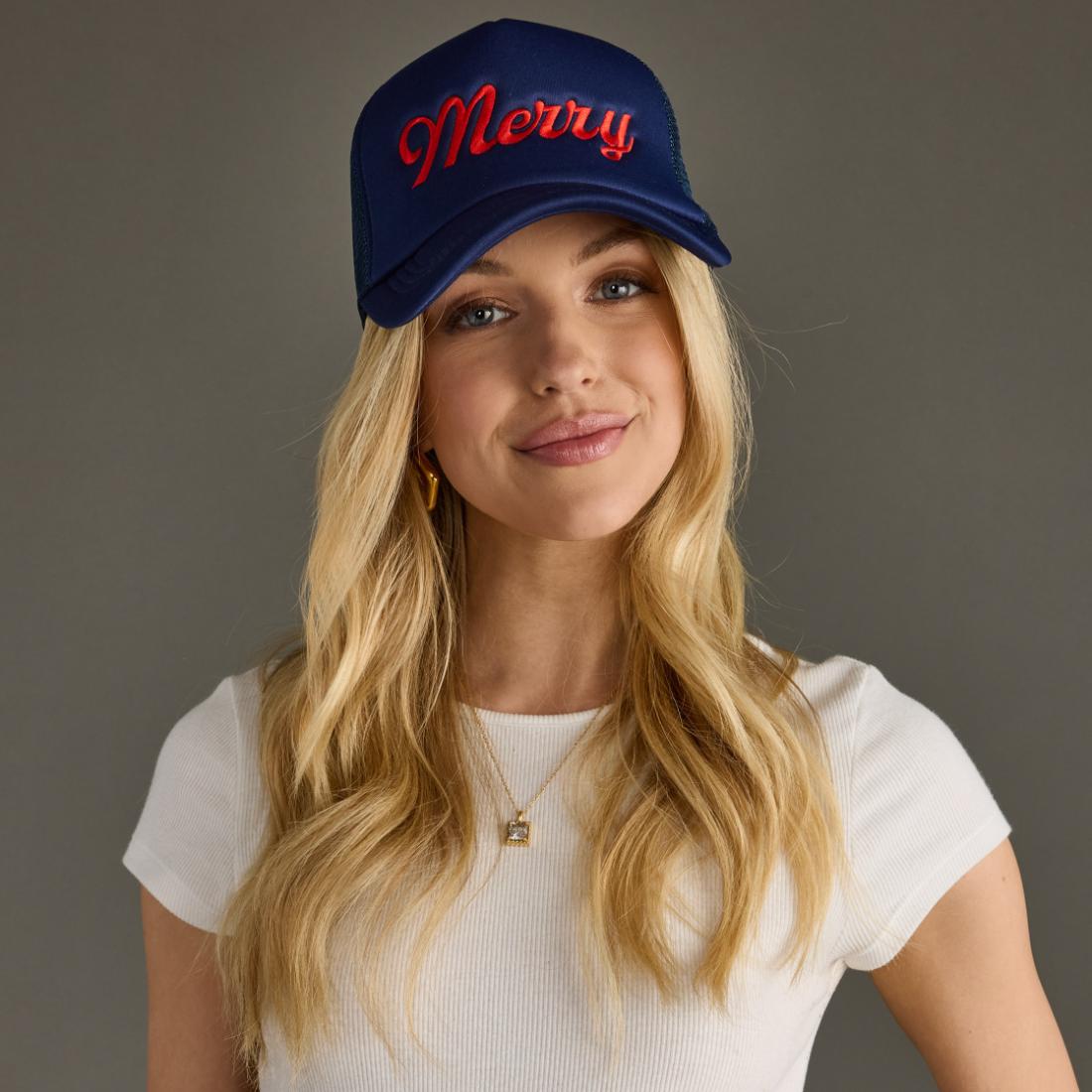 Spread holiday cheer with our navy trucker hat featuring bold red "Merry" embroidery on the front. This festive cap is perfect for holiday gatherings, casual outings, running errands, or everyday wear. The adjustable snapback closure ensures a custom fit for all head sizes, while the breathable mesh back keeps you cool and comfortable throughout the day. Perfect for spreading joy and holiday spirit wherever you go, this hat is a must-have for anyone who loves to celebrate the season with style.