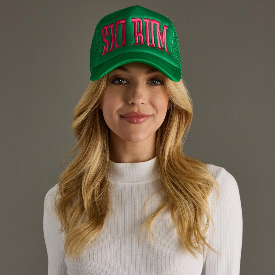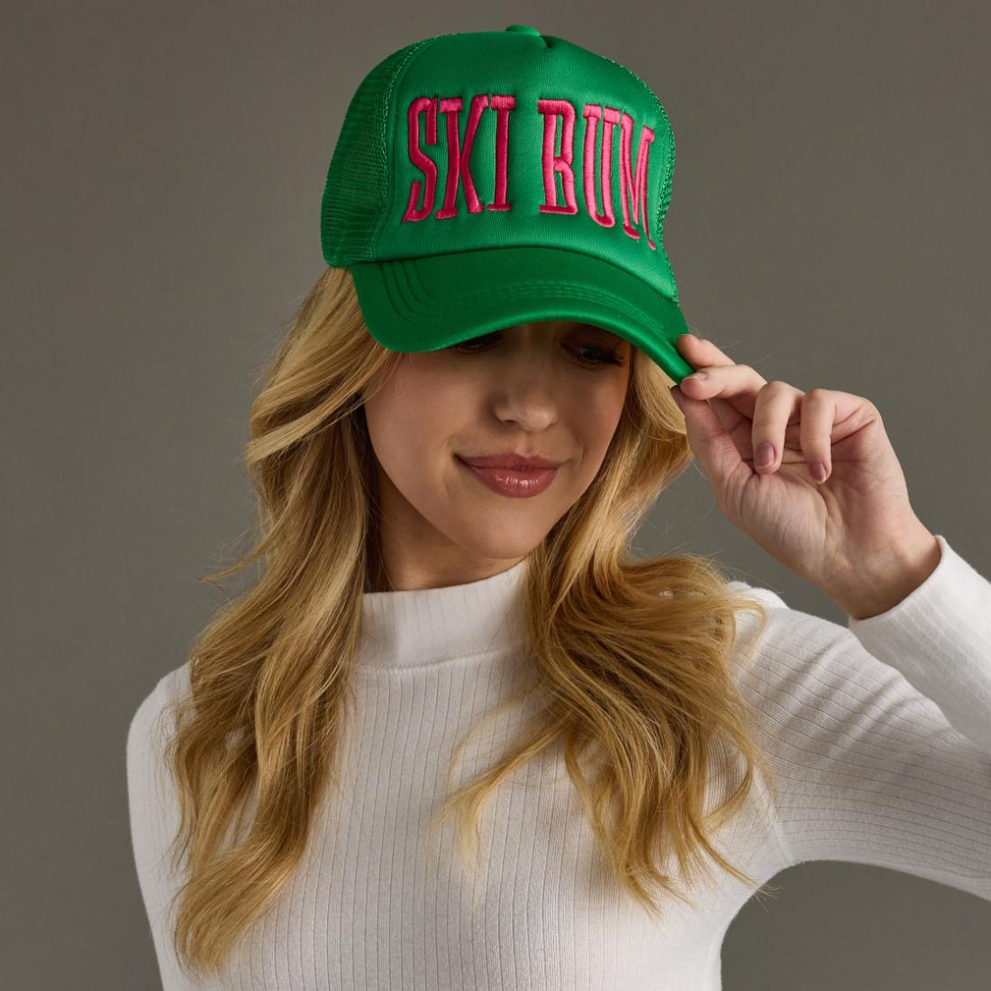 Celebrate the après-ski lifestyle with our green trucker hat featuring playful pink "Ski Bum" embroidery on the front. This versatile cap captures mountain town vibes and relaxed winter style, making it perfect for ski trips, après-ski gatherings, outdoor adventures, or everyday casual wear. Perfect for ski enthusiasts and anyone who loves the après lifestyle and mountain culture.